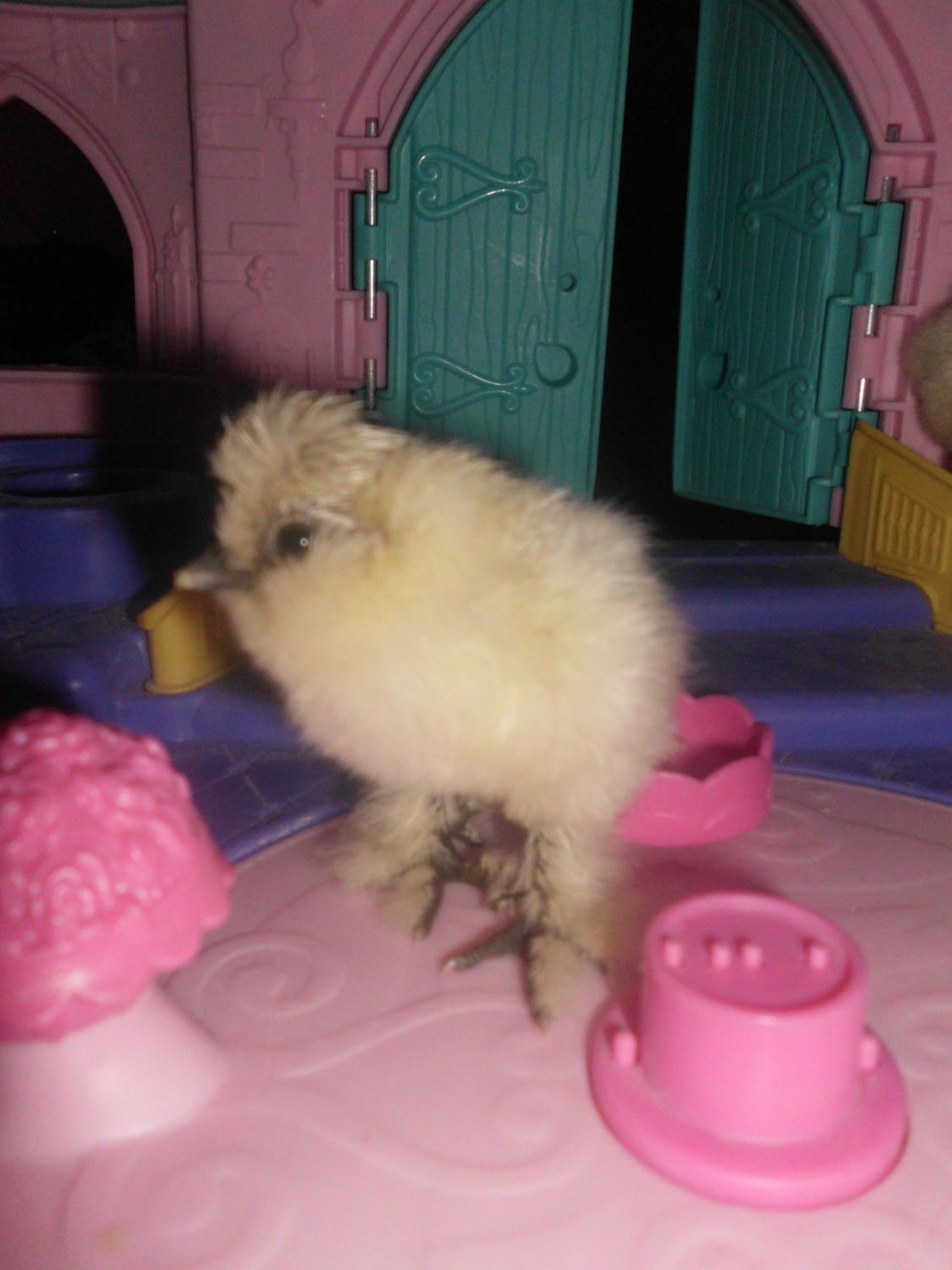 My son has been dying to take pics of the chicks in his little people buildings so since they have pretty much fluffed, I obliged. Of course I picked the only girly castle he has...lol We did this two years ago and he thought it was great...lol So, pics following....