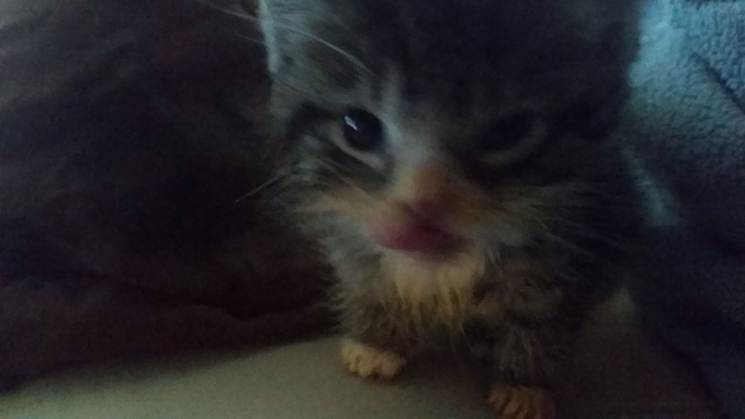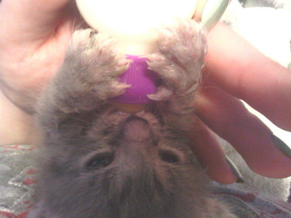 My Manx baby fresh after filling her belly.. She still weighs about 6 Oz less than her sis, but she's been playing and acting like a normal kitten, so think we're out of the worst of the danger..still have to make sure she doesn't chill and clean her (she is starting to figure this out)..