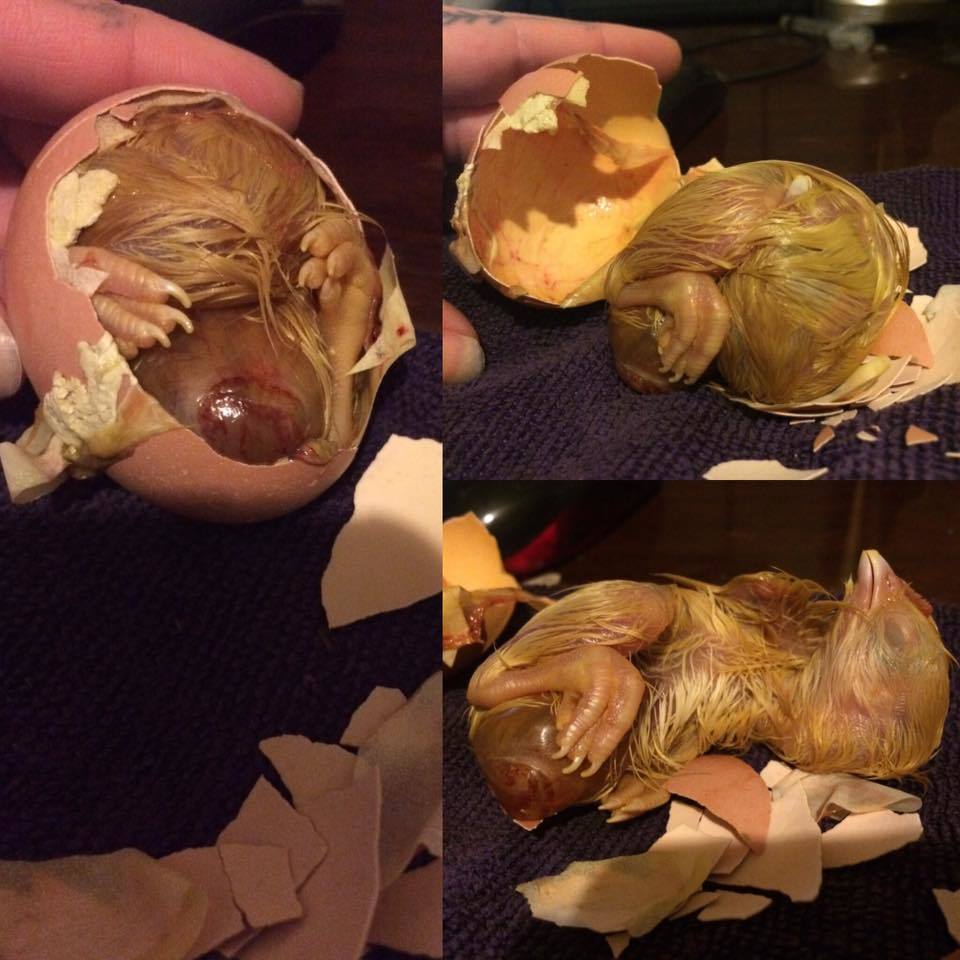 It's out of the shell. Yolk 100% absorbed and no bleeding, but it was so sticky that I guess it inhaled some of that goo and now it has goo coming out of it's nares. Prognosis is poor, but I'll try my best.