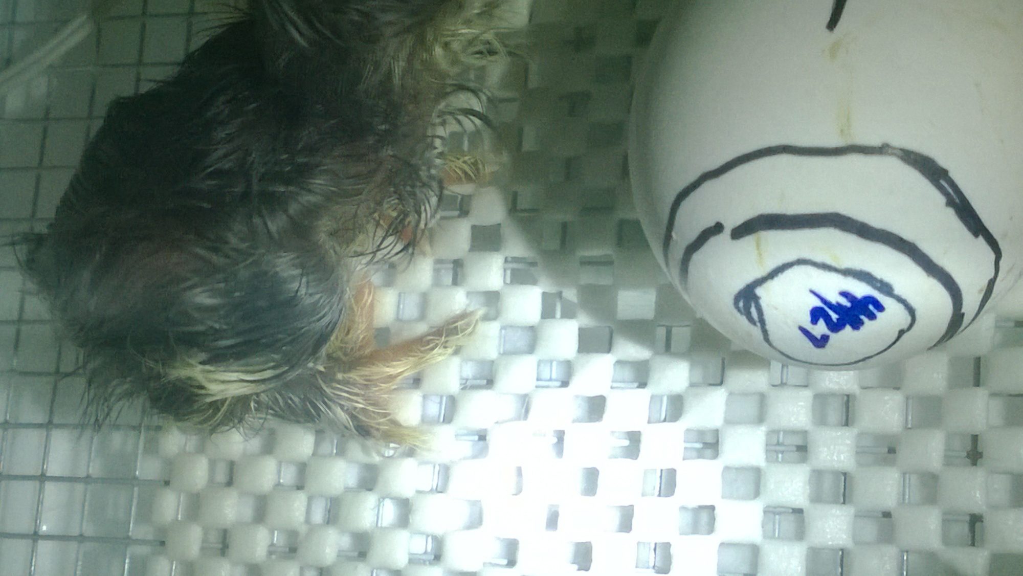 Ok, so 5 out, 4 nns and one feather necked. The malpo is still hanging in there, but he has a lot of unabsorbed yolk and it isn't looking good. 2 more external pips and one internal and one egg that is still living (well, actually the chick is), but not doing anything. I don't think it ever turned upright, so it probably won't make it. Looking like possibly 9?? Two I had set aside cause they were quitters and one had internally pipped Monday night. When I candled I could see shadow in the air cell, yesterday when I candled you couldn't see into the air cell at all. It was like the chick pulled down a blind. Last night before bed I tapped on the shell and got no response. Knowing that it was up in the air cell and having everything go black I decided to put a hole in the air cell. I could see the chick so I touched it-no movement. It was a goner so I opened it up. Yellow chick feathered neck. It had pipped into a major vein. Still had the bloody membrane in it's beak and blood going up the nose. The reason I couldn't see into the air cell was the membrane had been covered with blood. So it either internally pipped and bled out or drowned/aspirated on the blood. I hate it when they make it that far and don't make it out. It must have still been heavily veined for it to hit a vein in the internal pip.