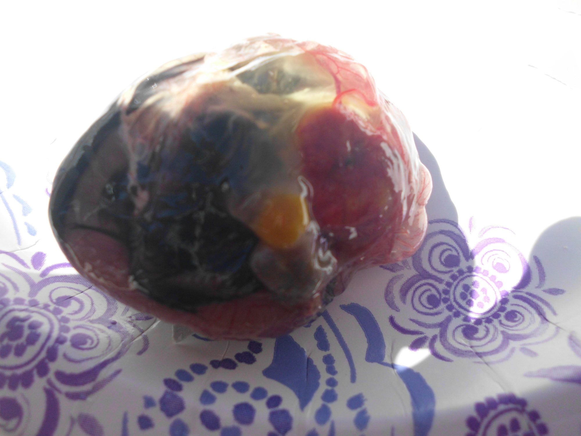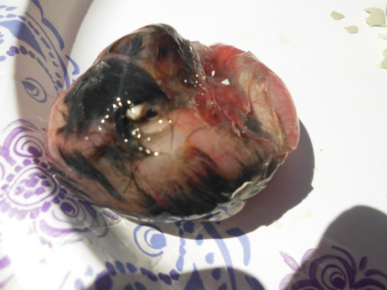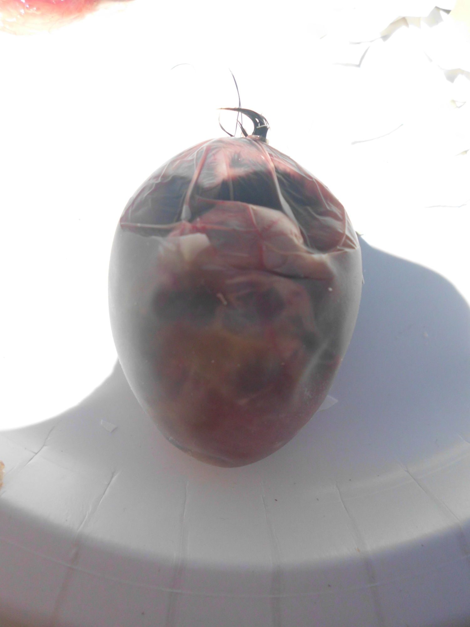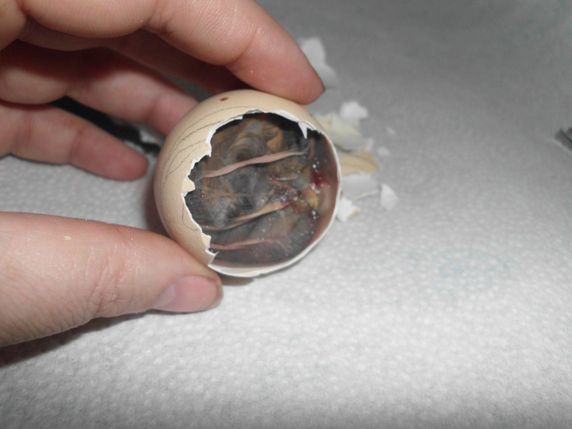 And this is what I was talking about. The outter membrane should be nice and papery white. That membrane lines the shell...BUT the inner membrane hugs the chick. That is 100% normal. I think a lot of people see this and freak out thinking that it is shrinkwrapping the chick because what do you hear on here the most...shrink wrap shrink wrap shrink wrap. And I will argue this until the day I die. Chicks do not shrink wrap that easily. Shrink wrapping is when all moisture of the membrane is gone and the membrane pulls taunt against the chick. It will literally pull the chick down with it as it shrinks. Think about untreated leather when it gets wet. As the leather dries it shrinks up becomes tight. This doesn't happen in a matter of minutes. It takes a while for this to happen. A chick that has pipped has a greater chance of the membrane that is exposed drying and gluing itself to the chick at the area of exposure. Now a chick with a normal pip in an incubator with adequate humidity can be pipped for 24 hours w/out drying out to a point it will cause complications. The more membrane that is exposed, the longer it is allowed to be exposed the greater the risk. My number one reason I wait till 18 hours to make a pip hole bigger, because once I do, that membrane has more exposure and greater risk to drying out. If at any time be it 6 hours or 16 I see an outter membrane turning brownish/yellow, (the sign that it is drying out.) I will pull it out moisten the membrane and check the inner membrane to make sure it is not adhering to the chick. I have started to prefer using neosporin on exposed membranes cause it does so well keeping them moist. Even in an incubator with high humidity (I think more so with forced air), if you have a large amount of membrane exposed-even if you do not open the bator, it can still start drying out.well, that leads me to a shrink wrap/sticky chicken question. if the inner membrane is starting to close in around the chick--as in the outer membrane is still attached to the shell, and you can see the inner membrane wrapped around the chick instead of attached to the outer membrane, and the inner membrane is still veiny, clear, and pliable, is that ok? in other words, as long as the chick can slide along the inner membrane and the feathers aren't sticking, is it ok if the membrane is encasing the chick instead of sticking to the side of the egg? is that what the inner membrane is supposed to do as everything dries up?