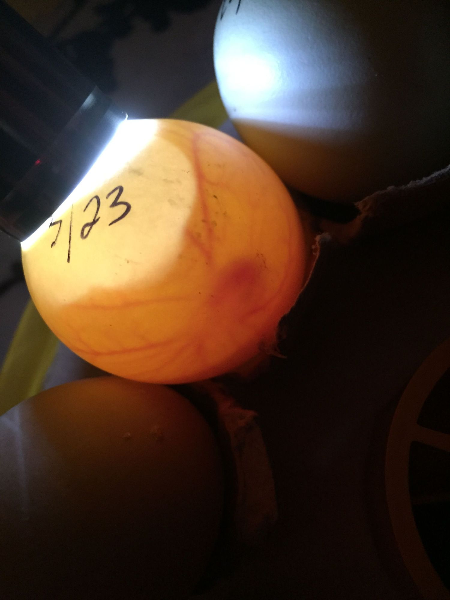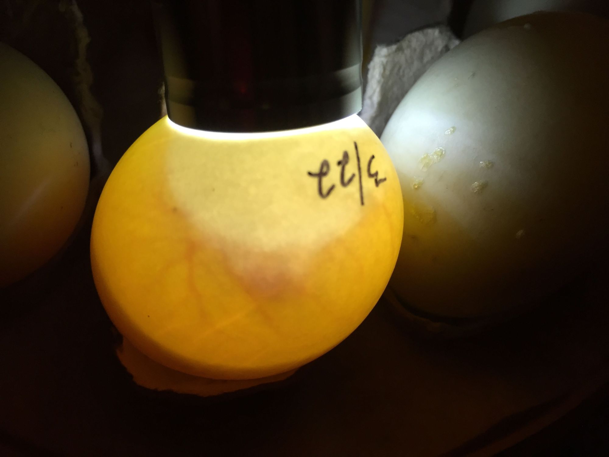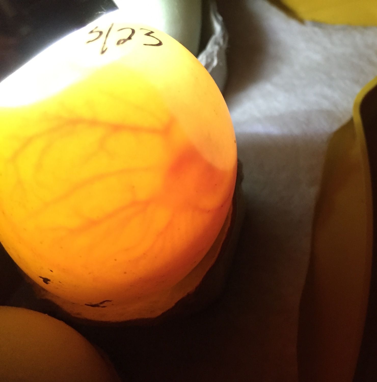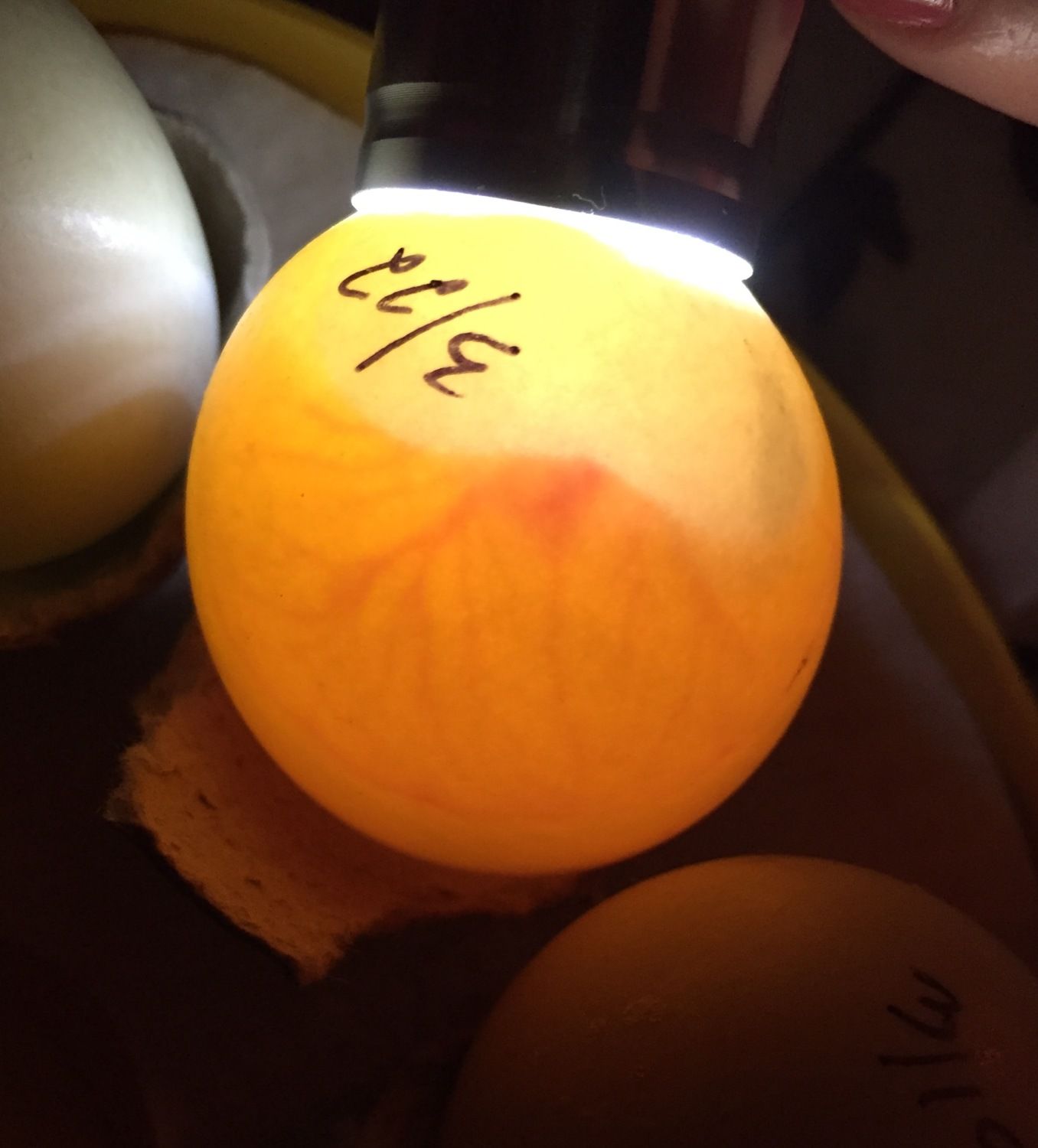 So here's some pics from last night of my call duck eggs with the terrible air cells. This morning one of them looked extremely saddled but like it may have reattached. I won't pick it up to check because whatever I'm doing seems to be working, so I don't want to handle it. If they keep going till day 12, I'll check them but honestly I'm very scared to lay them down. I'm afraid it will kill them if the air cells are still detached.