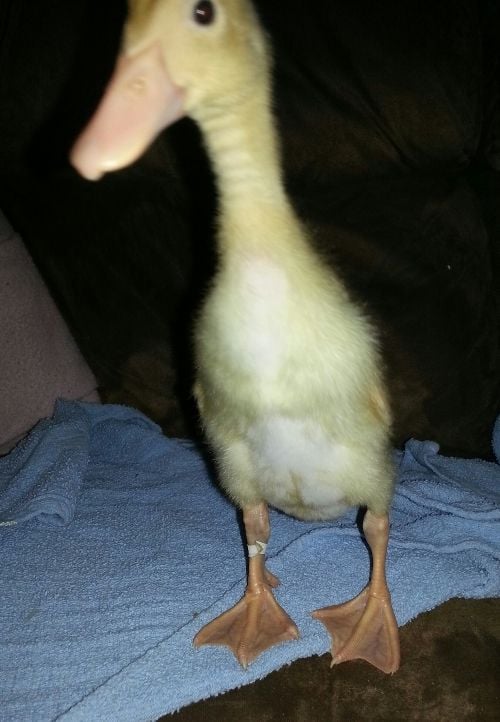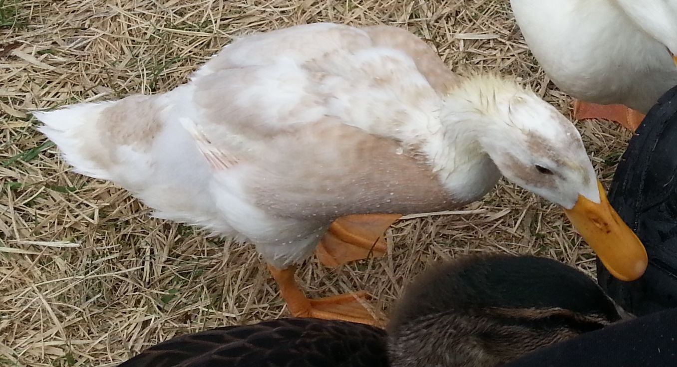 She is a fawn & white runner. The fawn hasn't come in yet and the white is yellow. No really, it is true... Look, here is a more current picture... Her blood feathers are just starting to develop.