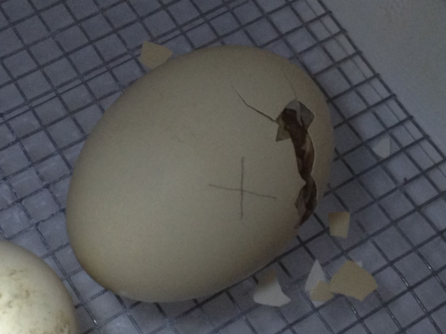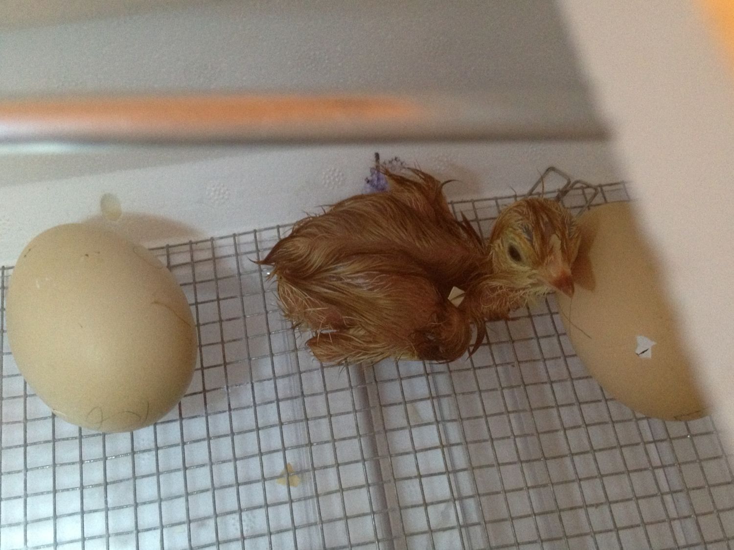 15.5 hours after pipping, we had the first hatch. RIR. I just happened to walk into the room to grab a file and I (as I always do) glanced into the incubator and I could see the first 'pipper' had ziped. I called the wife who had her hands full with making some dough. I took the tool out and started to continue work and though "I might just go back and get a photo" took a still, then swapped to video as my oldest boy walked in, 29 seconds later it was free! Amazing to watch.