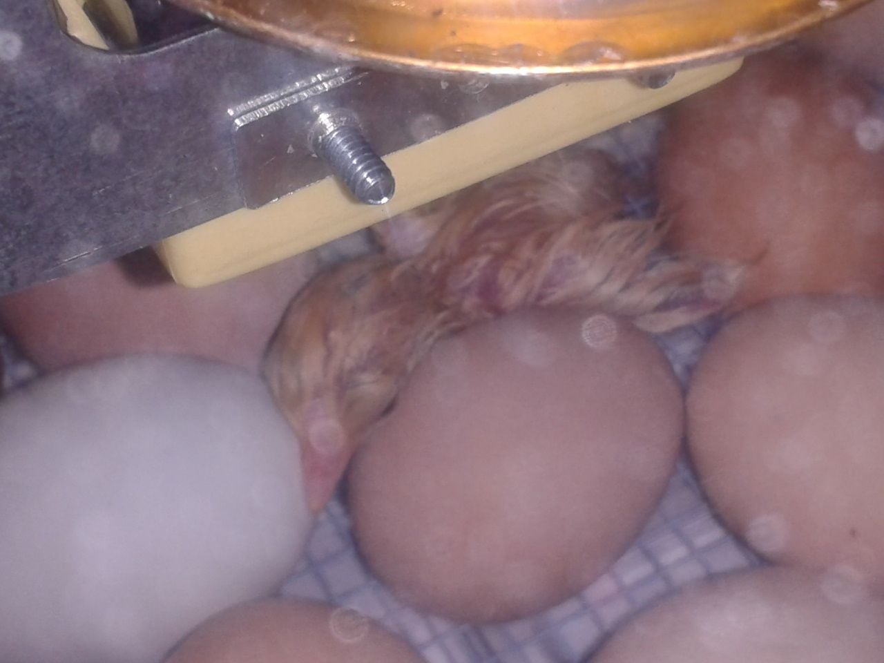 Acck! My post didn't seem to go through yesterday! We had one overacheiver out first thing yesterday! She (think positive) is for sure from my Light Brahama she's got feathed feet. Not sure who daddy is she's all yellow. As of this morning we have 5 more out and a bunch of pips! Wheeeee!