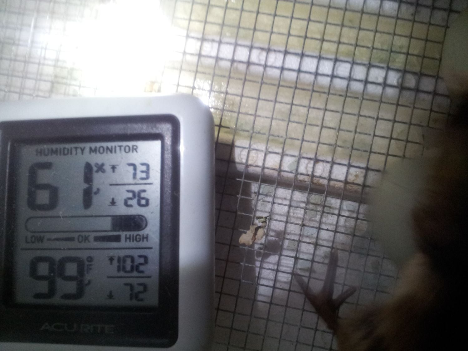 Pictures!!!! The thermometer showing humidity- the chicks finally got off of it so I could see where things were at inside the bator,, the last one is my assist chick- keeping my fingers crossed it pulls through, the membrane was drying out and starting to brown....not what I wanted to do on my first hatch, but felt so bad about losing the other chick and not trying to help it.