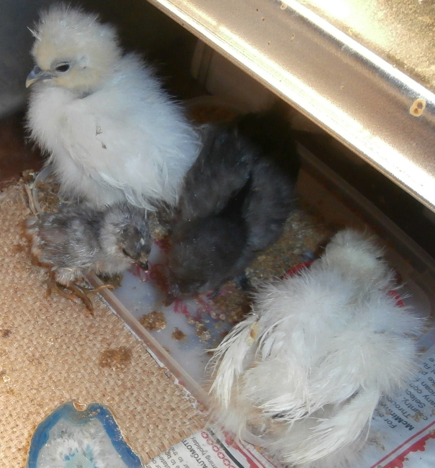 My tiny Jaylee was moved to a brooder, & in w/ 3 younger than her Silkie chicks DH bought for me at Dalton show yesterday.