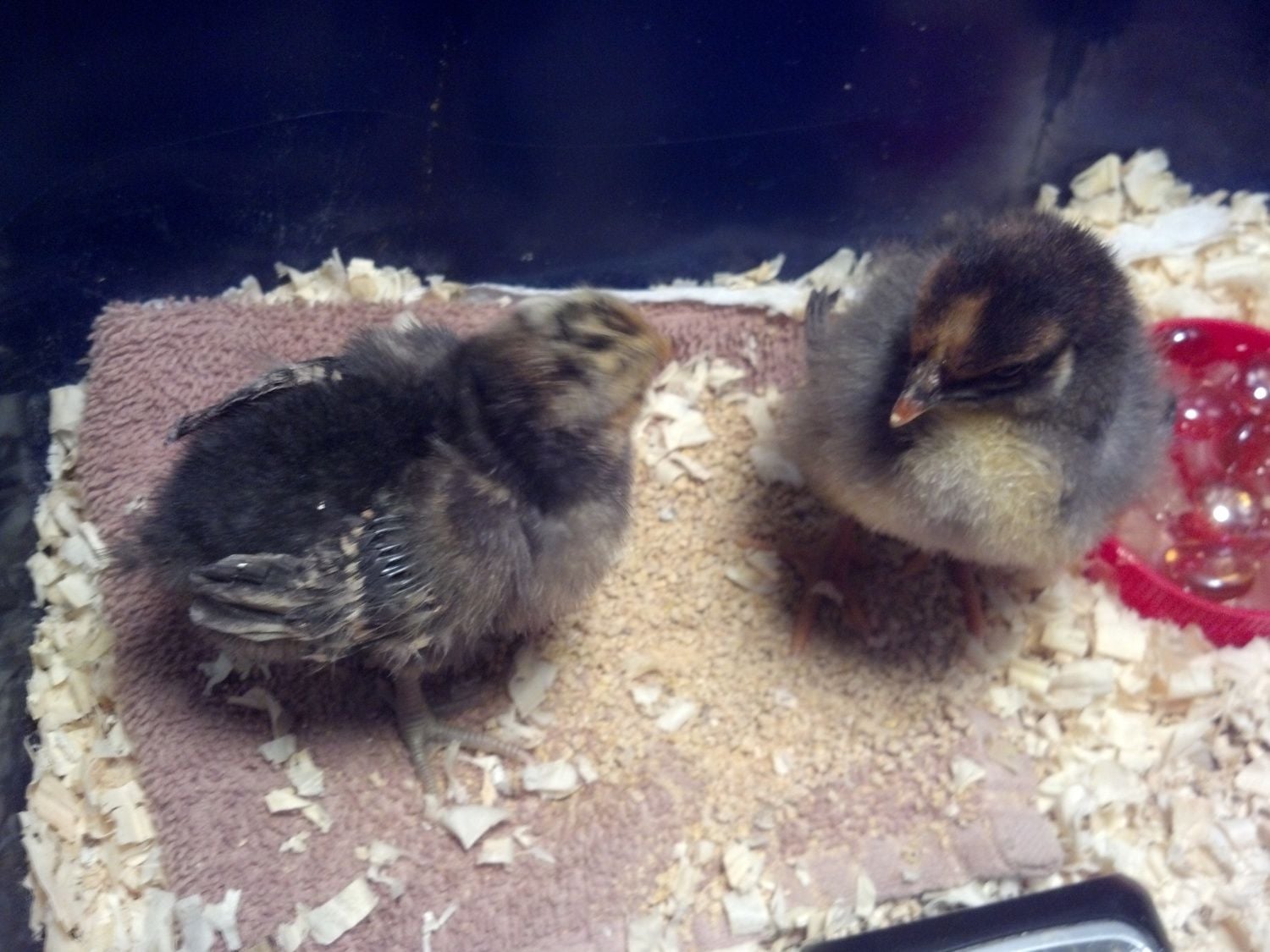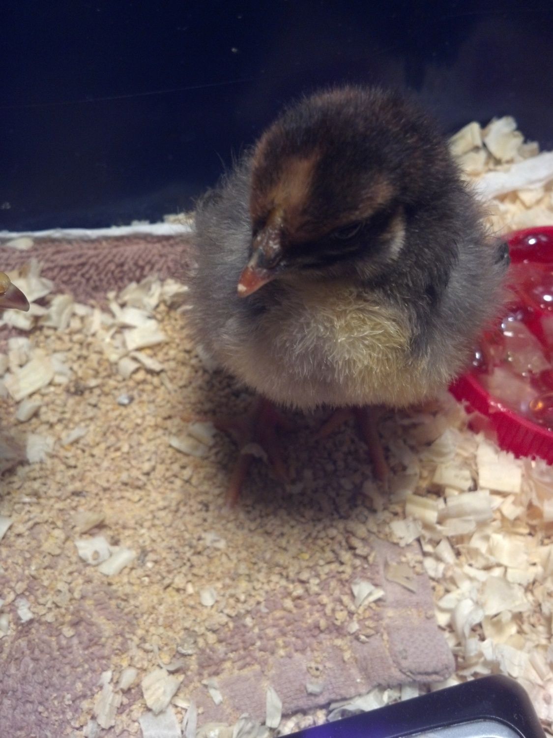 We put a small perch in the pen for our little ones. They are flying up onto anything they can now, and seem to like setting up on a divider bar/door sill for the big birds' coop when the door is open. So Radioman found a 1 ft piece of 1/2" by 1/2" trim and used finishing nails to attach it to two pieces (about 4" long or so) of 2x4 scrap. It isn't very high off the ground obviously but the little ones sure seem to enjoy it and I think it is helping them learn their balance because they are on and off of it constantly now without trouble.