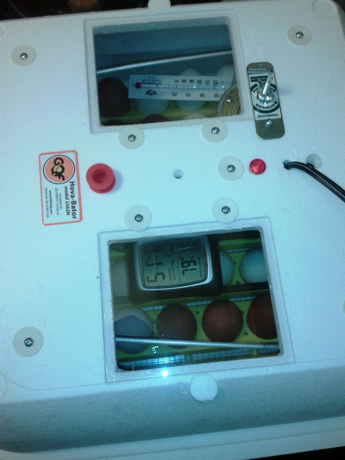 I love all the home grown and local eggs Look at all those colors! I could not find much local and dream of hatching my own someday!I got the same therm/hygrometer and have the little giant, so it looks very similar, except your's is full and mine only has 13 ;)