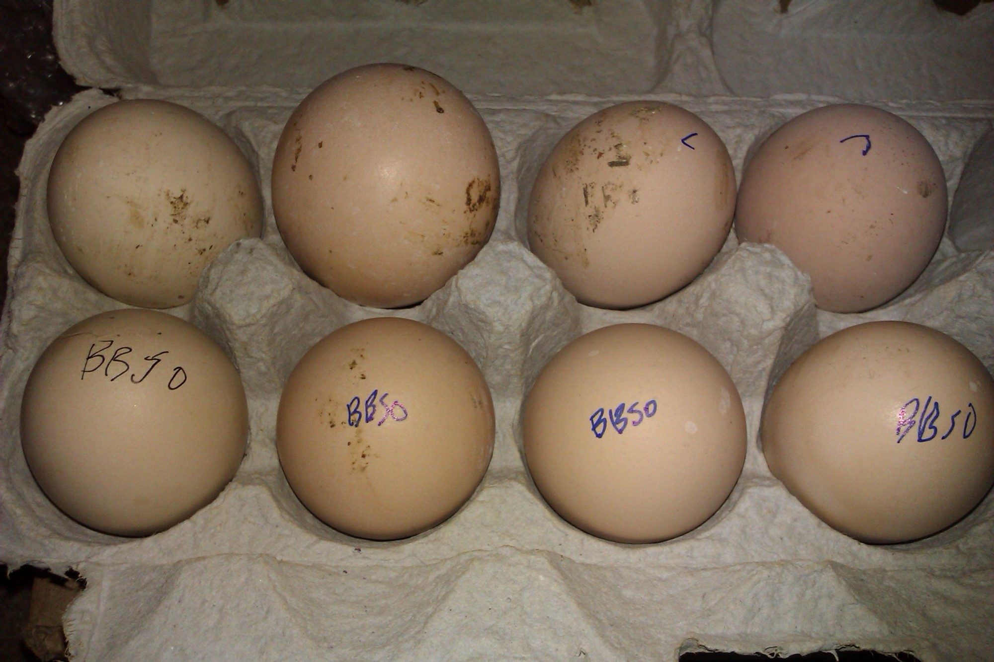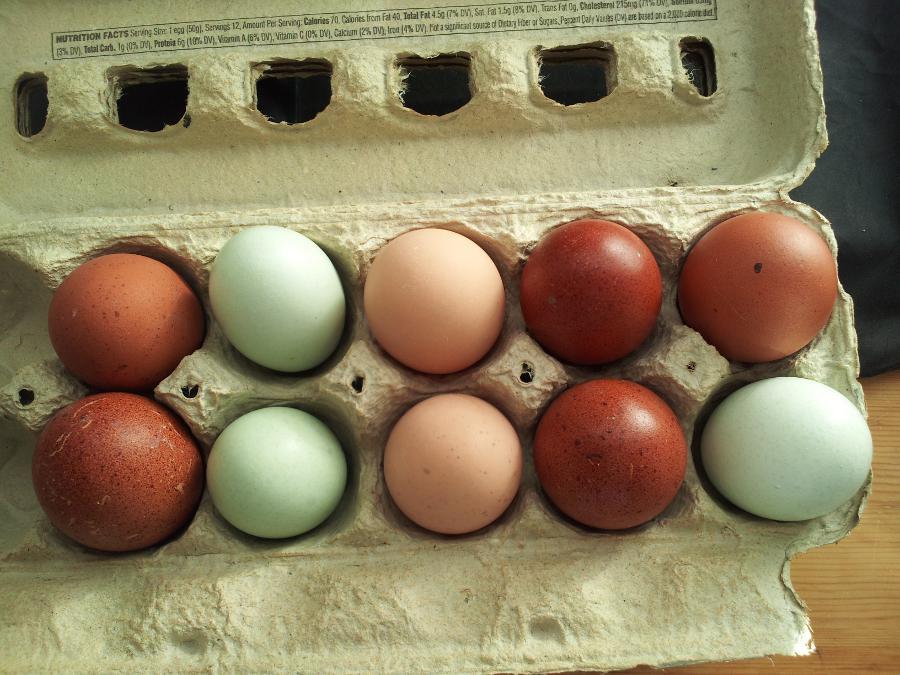 I got the White Maran eggs from a nearby farmer. It was quite an investigation, finding someone with nice Marans within driving distance. This guy has no internet presence. I found him randomly through the chicken grapevine. This guy raises 8 breeds of Marans, and they are all beautiful! Fully feathered legs, and most of them lay pretty dark eggs. They look lighter in the picture. The White Maran eggs are the lightest eggs you see. I chose them purely because they were such pretty birds. It was super hard to choose which of the 8 colors I wanted.