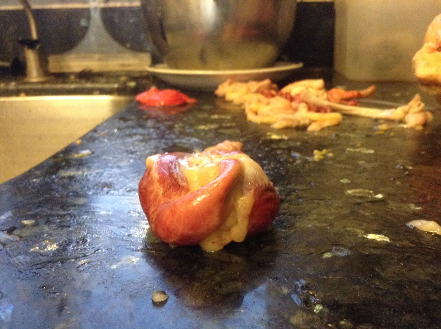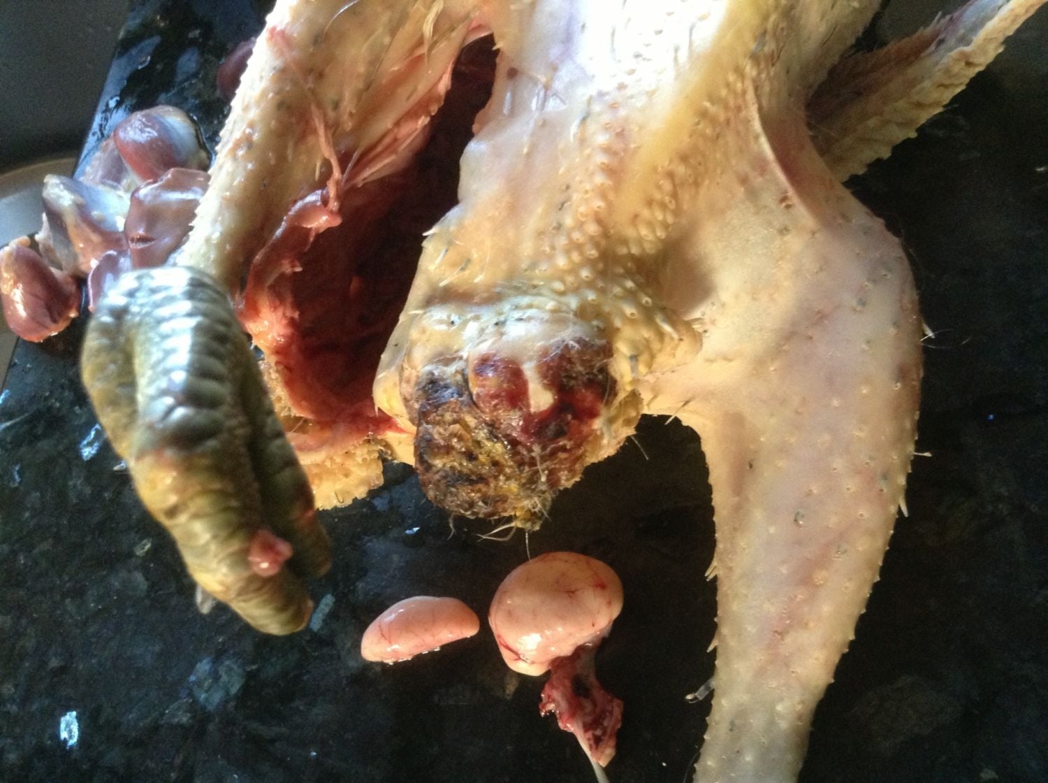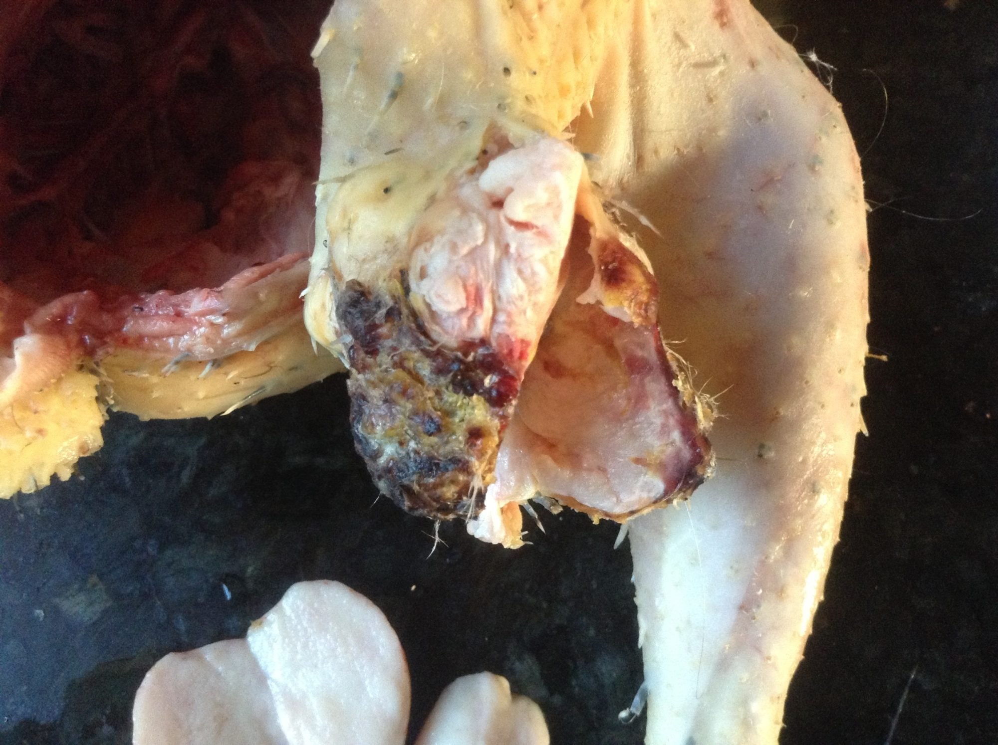 The first two had enlarged hearts. One had tumor on the back. One had a deformed gizzard (picture below).One had crippled leg and because he was not a pullet, so we butchered him, and found that his crippled leg wasn't an injury. It was caused by a huge tumor on the muscle that was probably inhabited the nerve. He also had one harden enlarged testicle (picture below). One of the six I didn't bother to do an autopsy.