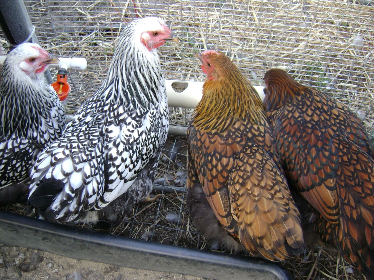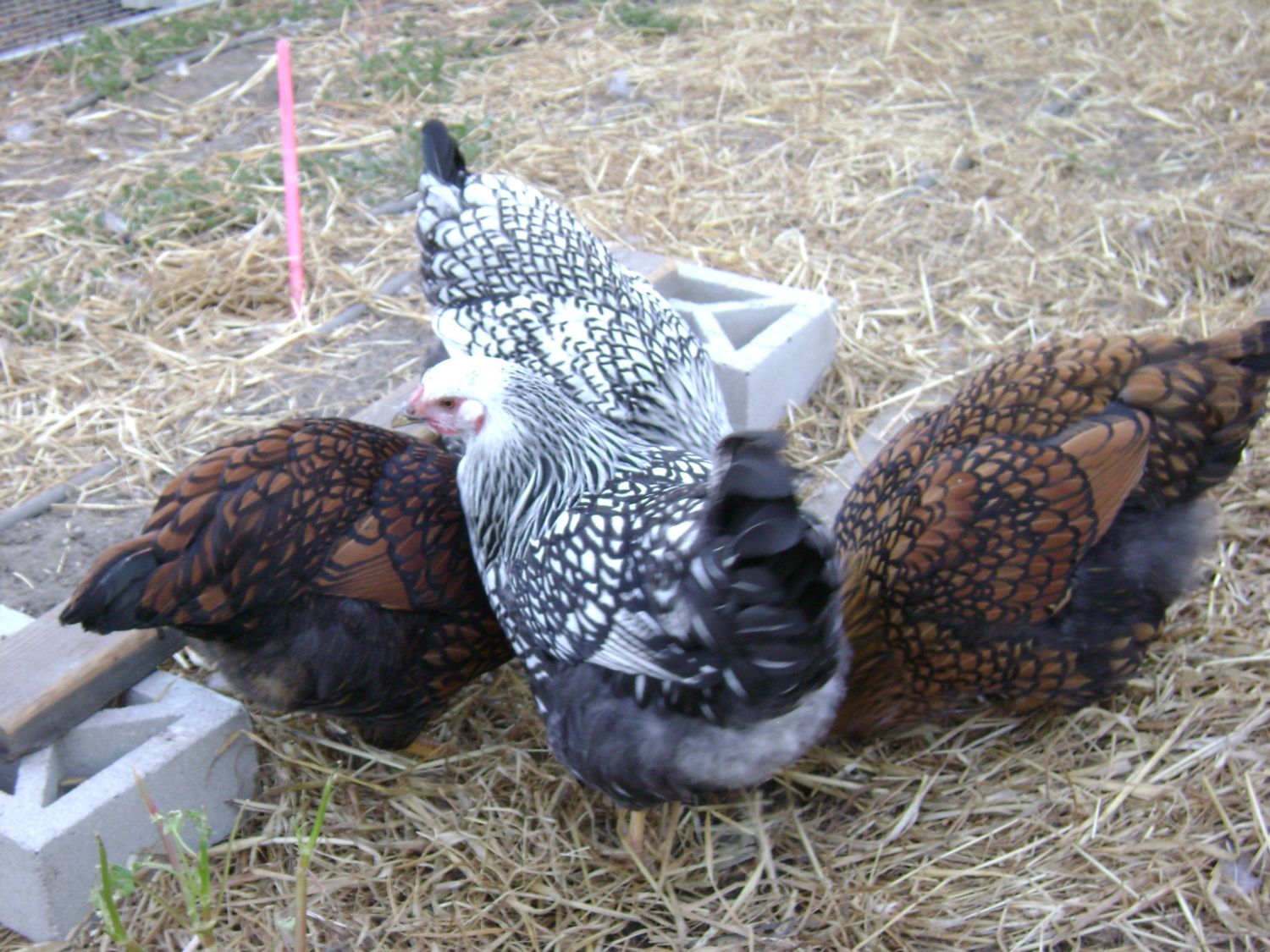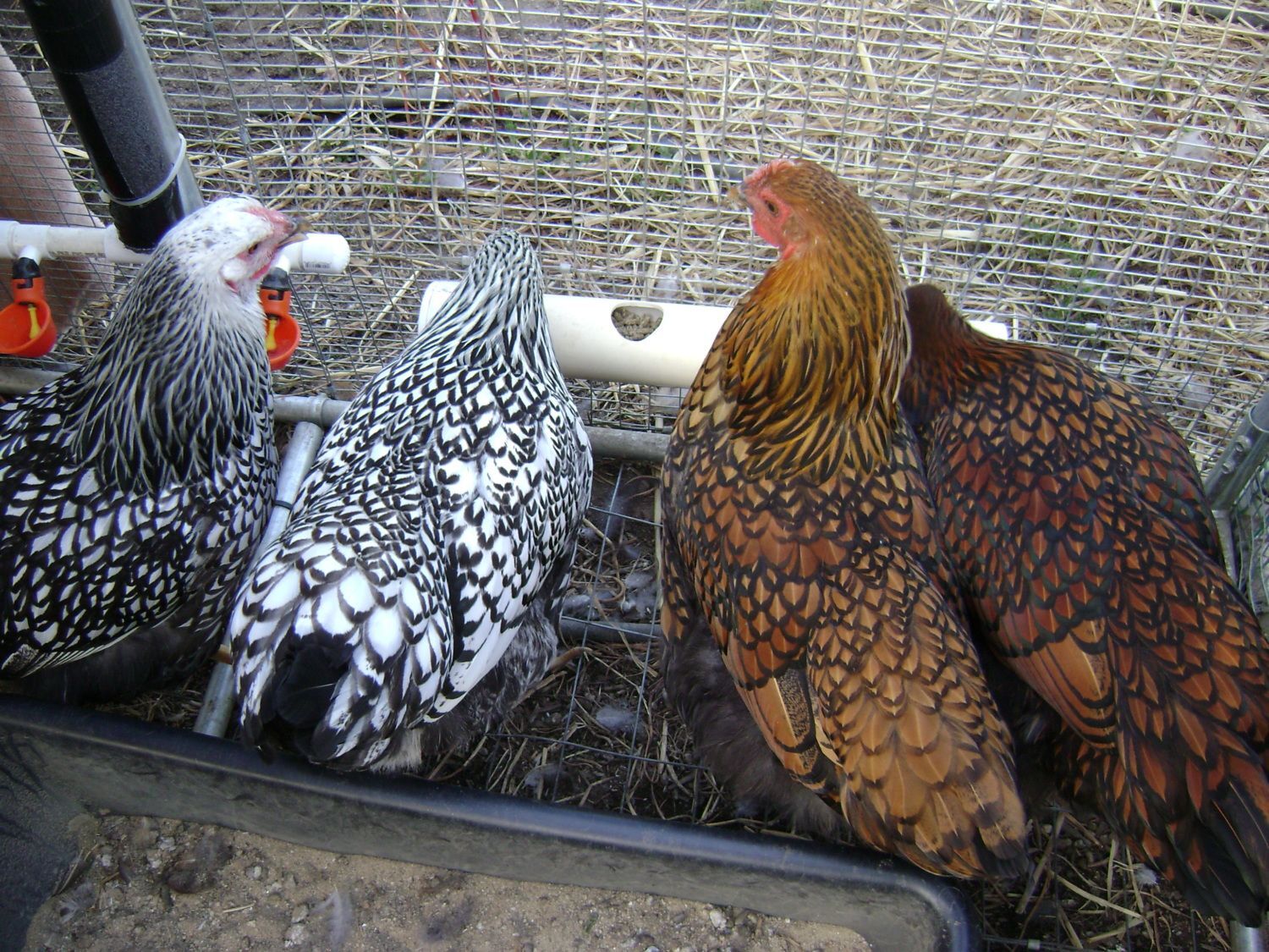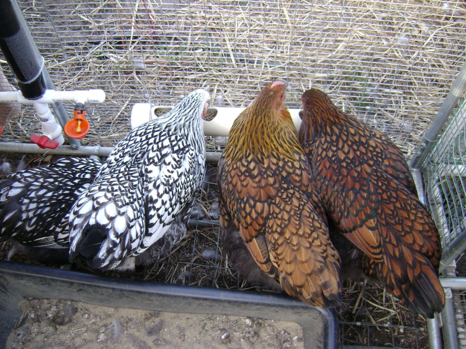 Goldie to the left, Mollie center, Millie in front of Mollie & Gertrude to right. We got these as Day old chicks, handled them often until they made it clear they didn't want to be handled at which point we continued to hand feed them treats. They're not afraid of us, if I'm working in the run they're right there, but they don't like to be touched. Last night however, Gertrude, squatted & let me pet her momentarily, then it was business as usual. I should have grabbed a fist full of feathers, pinned her to the ground & slapped her around a bit. Maybe they would like us better!