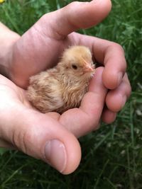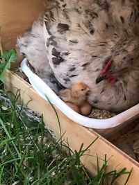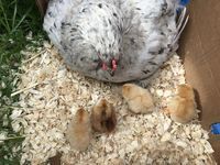 First one out :) Brand new baby!! Three are half buff/quarter leghorn/ quarter rir And one is 3 quarter rir/ 1 quarter leghorn (sex link roo;) )