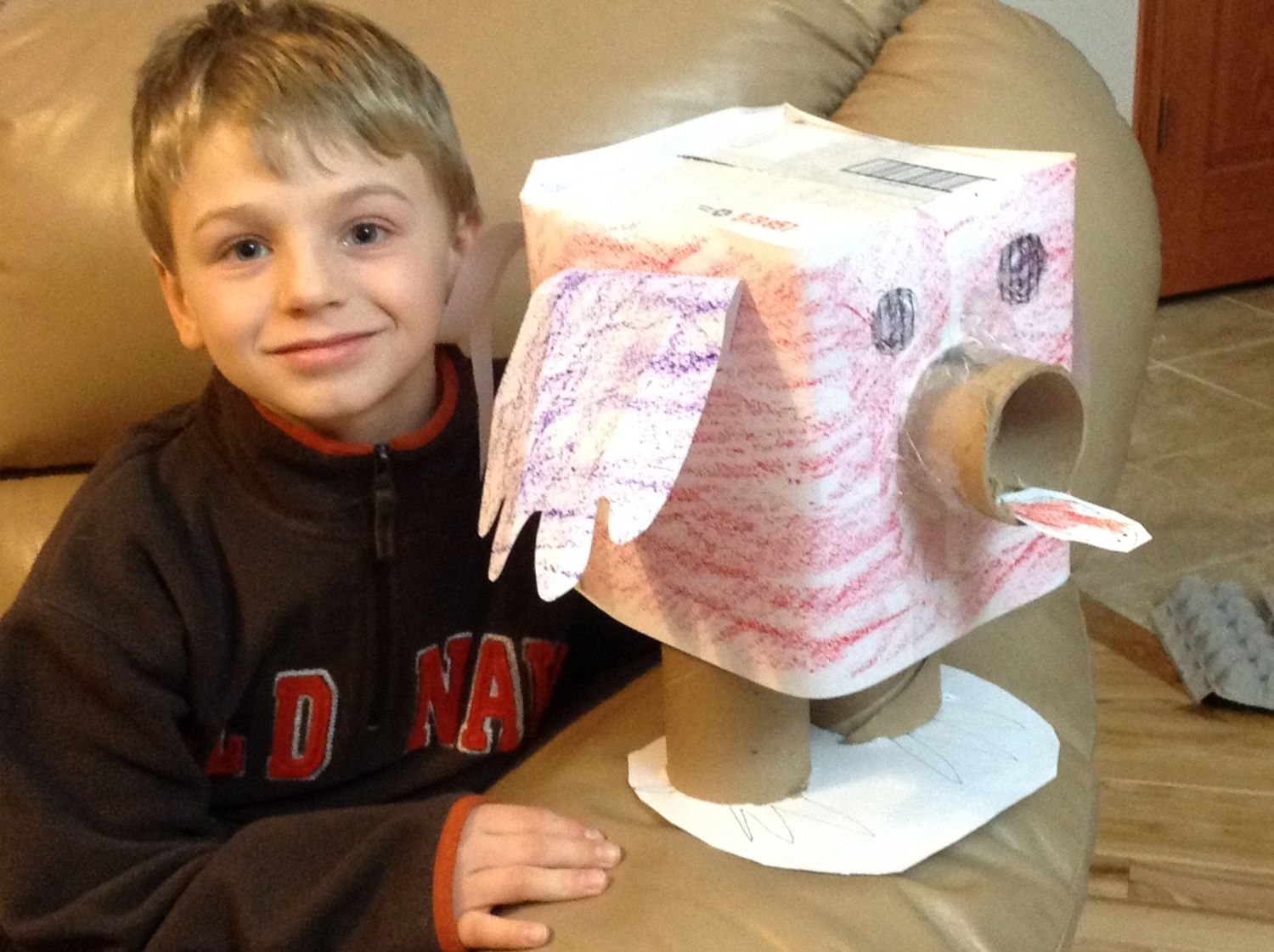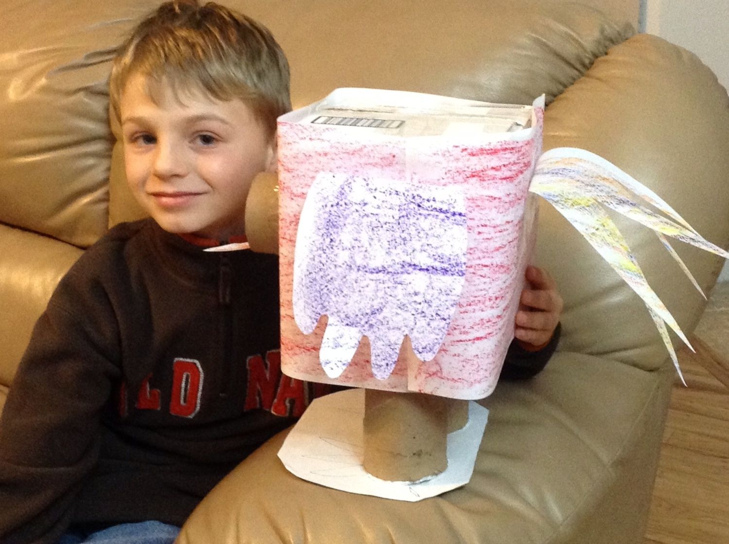 He has a red bag that will be stuck on top that his teacher helped him with. All his idea and all his work. I think he used half a roll of packing tape getting it stuck all over everything. My little chicken farmer! That's a mealworm sticking out of the beak.