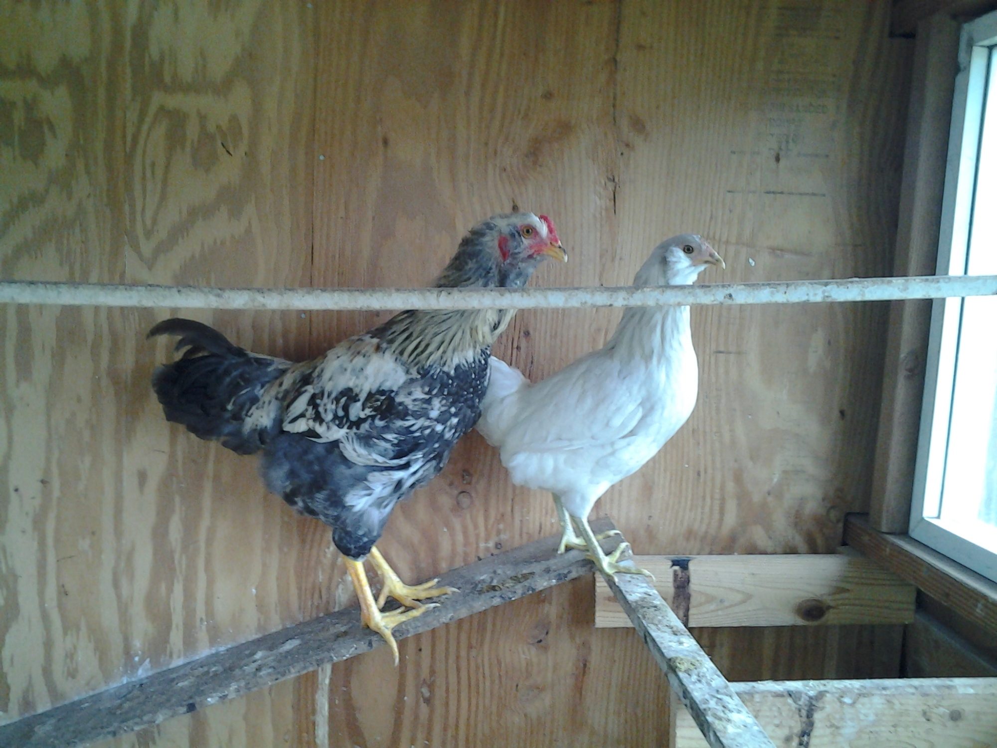 These are my two November chicks, the first chicks I hatched. They're 16 weeks and He's started trying to crow - sounds like a dying cat.