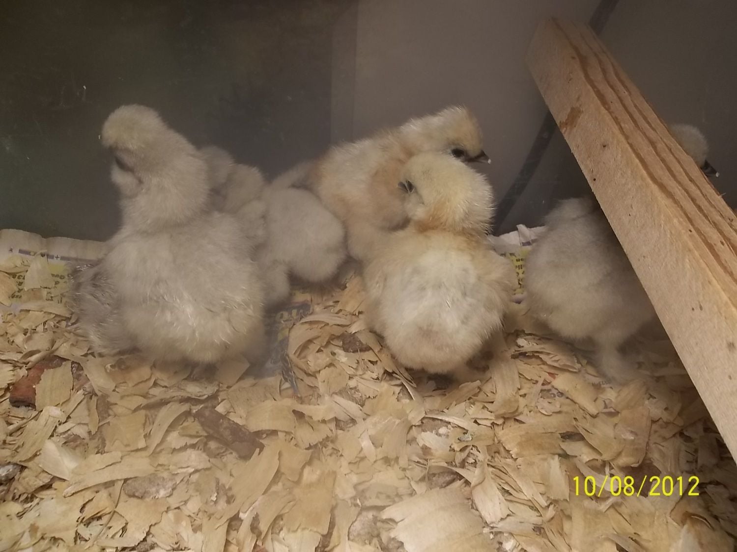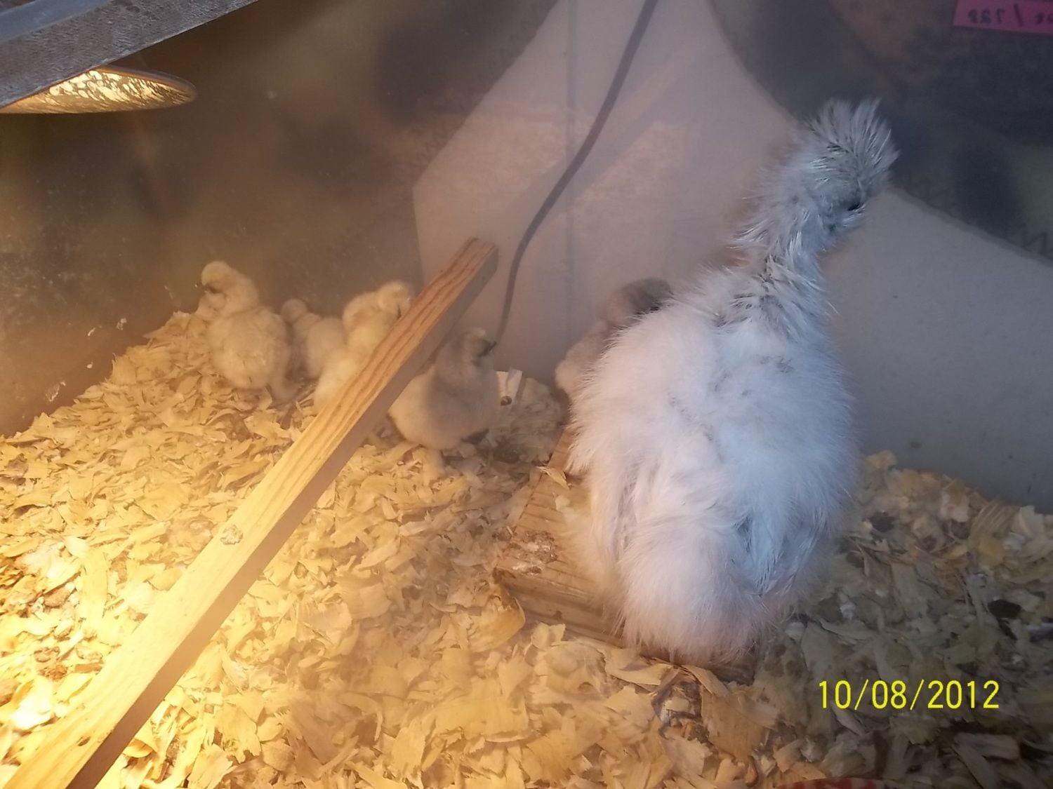 Here is one of my 2 month old chicks playing momma to her second set of babies. She has a strong mothering instinct. I think she's a keeper for baby raising. In the pic she was calling the chicks to her so she could sit on them. They had just came out of the bator and where still wet and the brooder hadn't warmed up yet. So I put little momma in to do her thing. Once it warmed up I put her back with her other 7 babies. The dark baby is a glue split to lav and the light one is a splash. There is another splash but it didn't go to her but to the heat lamp instead.