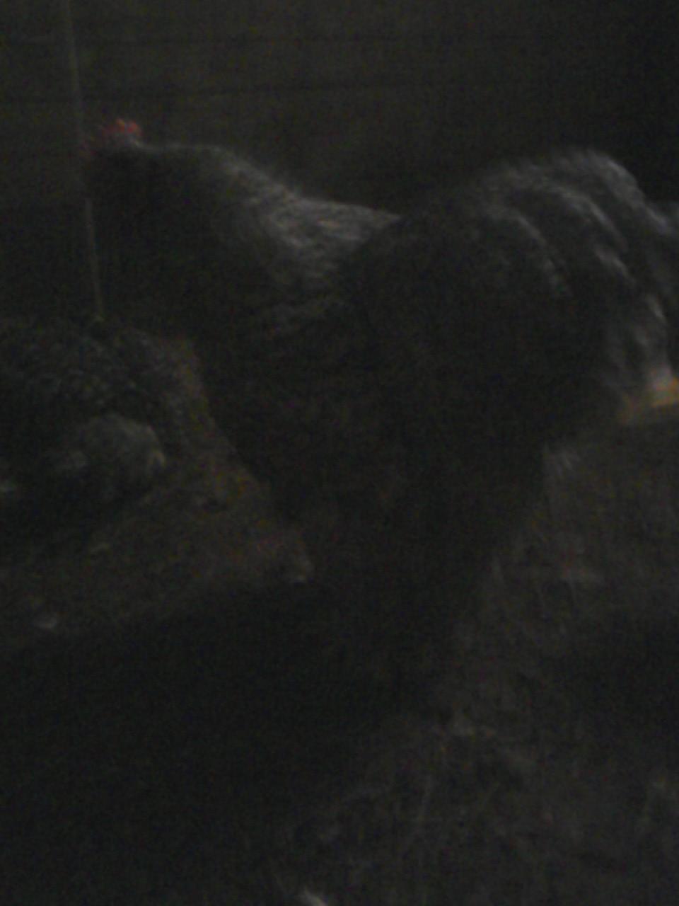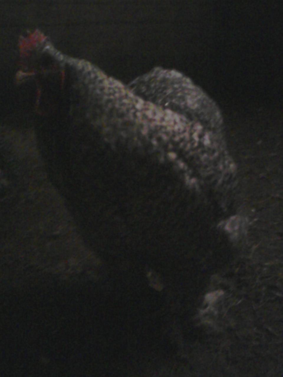 My camera takes lousy pictures anyway, and in the barn it's really awful, but here are two of my enormous barred cochin roo from CPL. They really don't do Fat Elvis justice at all!