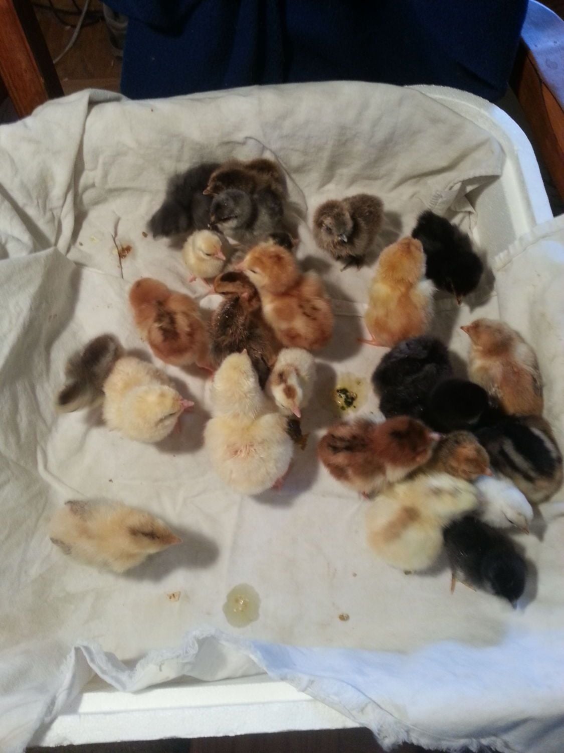 ummmm......no clue, lol!Ok...I have a new addition to the list of very unhelpful "helping" of non chicken people. My roommate has Asperbergers. She loves the chicks! She was very "helpful" this morning and moved most all of my brand new and breed separated chicks that hatched yesterday and put them all together in the main brooder!!!! I think I know them all apart, but I will offer a very special treat box to anyone who can correctly confirm the identity of the chicks below. I can send better photos...but guesses??? I send good treats......