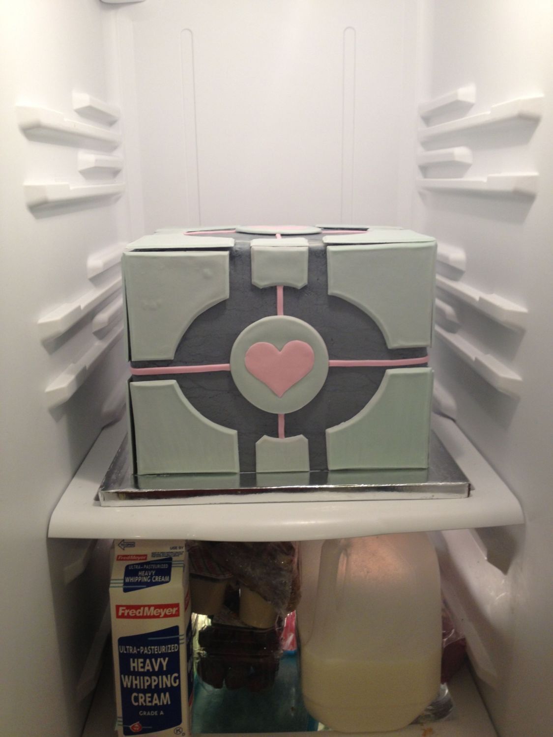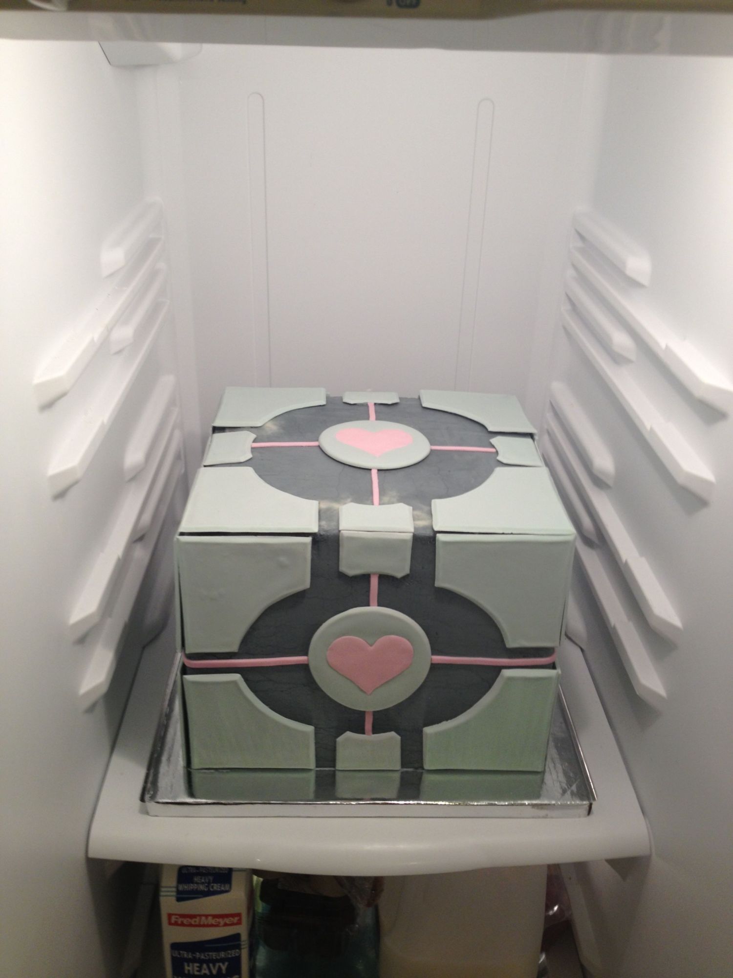 This is the cake my friend and I made for someone's wedding. They play an rpg game called portal? And this is pretty significant to the game I guess. We had to make a few adjustments as she dropped a layer when she was sticking the cake so it would up being an inch too short.such is the life of a cake artist. At least we were able to adjust it well enough though I still have to adjust a few panels. Now have 40 cupcakes to bake and decorate to go with it.![]()
