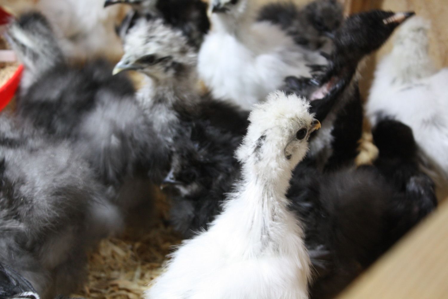 I moved my silkie babies tonight to the basement brooder. Thought I would get a few pictures of them running around. All of the paints are from my birds along with the blacks. The blues and partridges are from sebrightmom. There are also some jersey giants in there. One paint looks to have a black stripe down the back of its neck. Another has a nice partial black wing. You can see it in one of the pics.