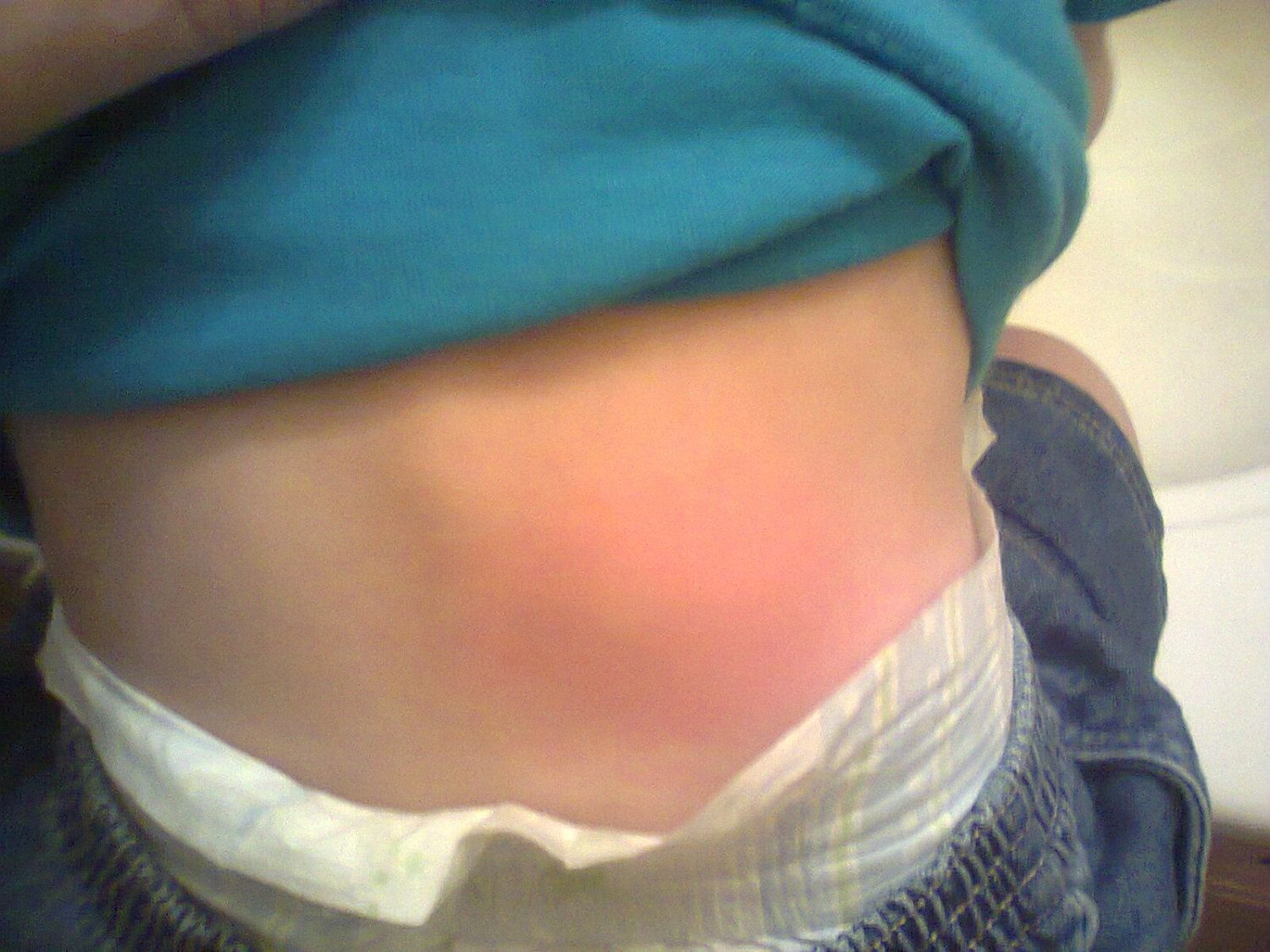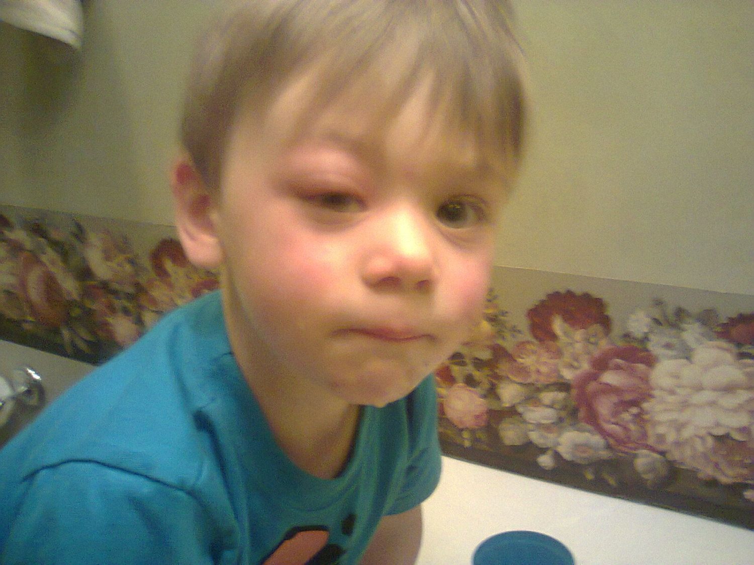 Poor wee'in. This is my little guy after a rogue bumble decided it had it in for him. Got him in the eye, then came back and stung his back. "All done bee, ALL DONE BEE!" He was jumpy about anything small and flying for months. :(