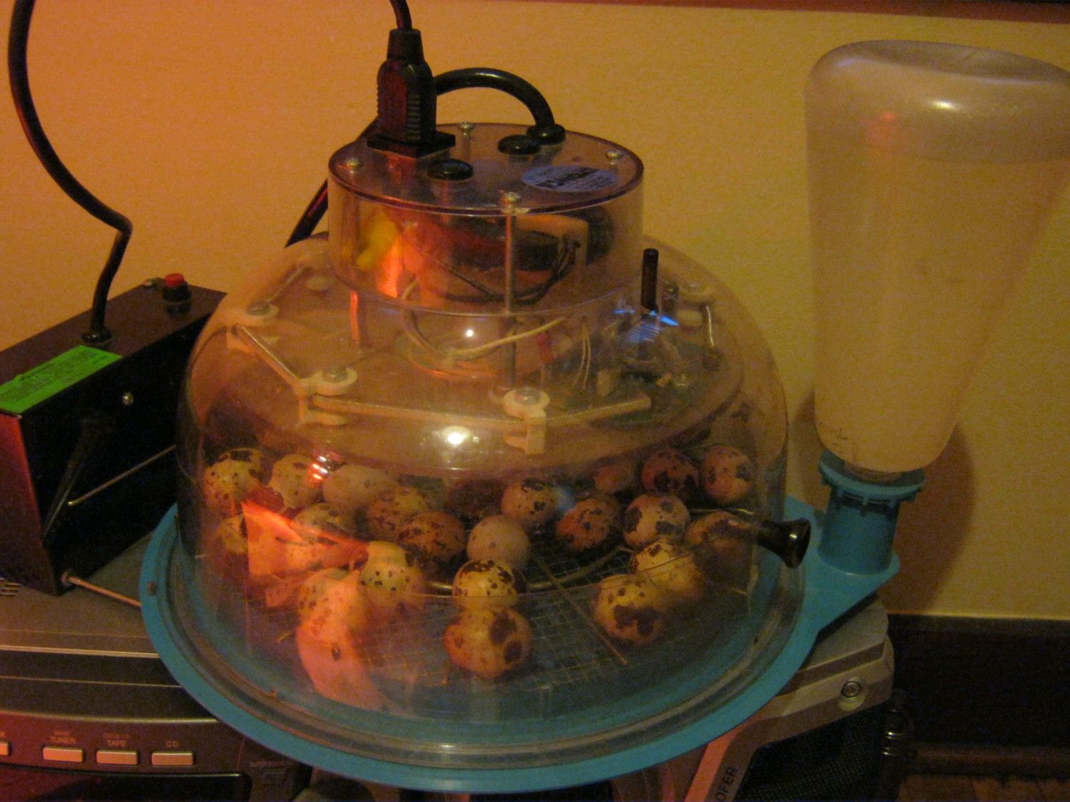 Day 3: @ 48hrs of incubation Fat Daddy hinted me to shoot for 35% to 40% humidity and stand the eggs up right. So I took most of the water out of this incubator(Marsh) and switched the eggs out to the LG incubator with eggs < 14g. (which I have taken out all the water for dry incubation, the humidity in it is however still at 63%. I guess there is still water in there because it's not completely dried off when I poured the water out).
