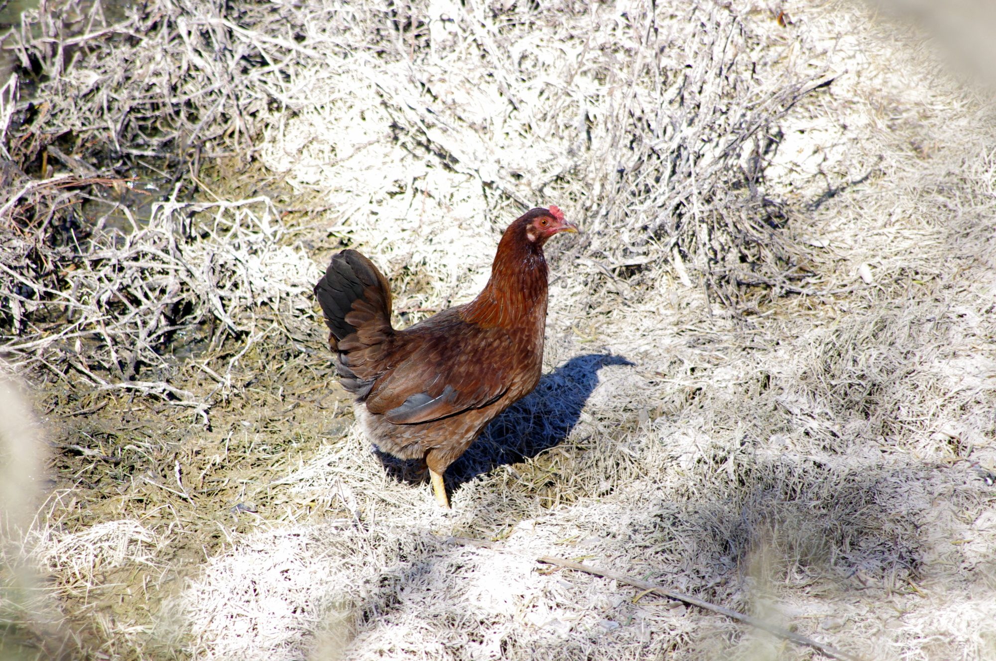 I believe that whether are not human help and intelligence is needed, is totally dependent on the environmental conditions. In the Amazon my birds do fine with no help whatsoever, but here in my region of Texas, chickens are incapable of surviving without human help. In the last year I have lost over 100 free range (non-penned) birds to the environmental conditions in my area (i.e. weather, disease & predators). I have 10 acres of land for them to roam on, of which 6 acres I have developed to plant grains for my flock to free forage upon (Wheat, Milo & Oats). None of the birds (over 100) that were free ranging are alive today. Here is a picture of one my last little free range flock under a deer feeder that is about 300 yards from my house by a stock tank. This flock was so wild that I almost never saw them except on my game camera photos. Every single one of these birds were killed by hawks in February along with many others that are not in this picture (about 30 birds in all).