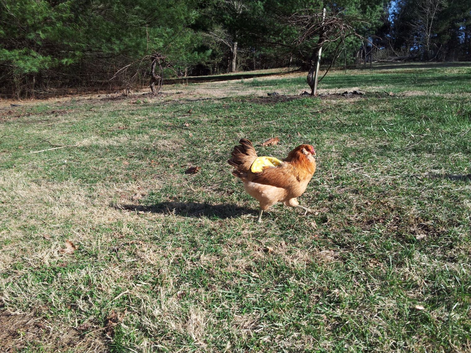Liz, maybe our roosters need to go to school together to learn to be easy on the hens! I ordered 5 saddles, one for each EE. I only put one on Cleo, since she was the worst off. She happens to be my most skittish hen… and let me tell you, that was a chore! To be honest, all the EE are pretty skittish. I sure hope no one is watching when I catch the rest up! Darth Vader is next, with MJ not too far behind. Great pics! I loooooove that everything is turning green again! We have been super busy today pruning (a bit late, but firewood took priority) the apple trees. They are a real mess. I would guess it may have been 10 years since they have had anything cut off of them.