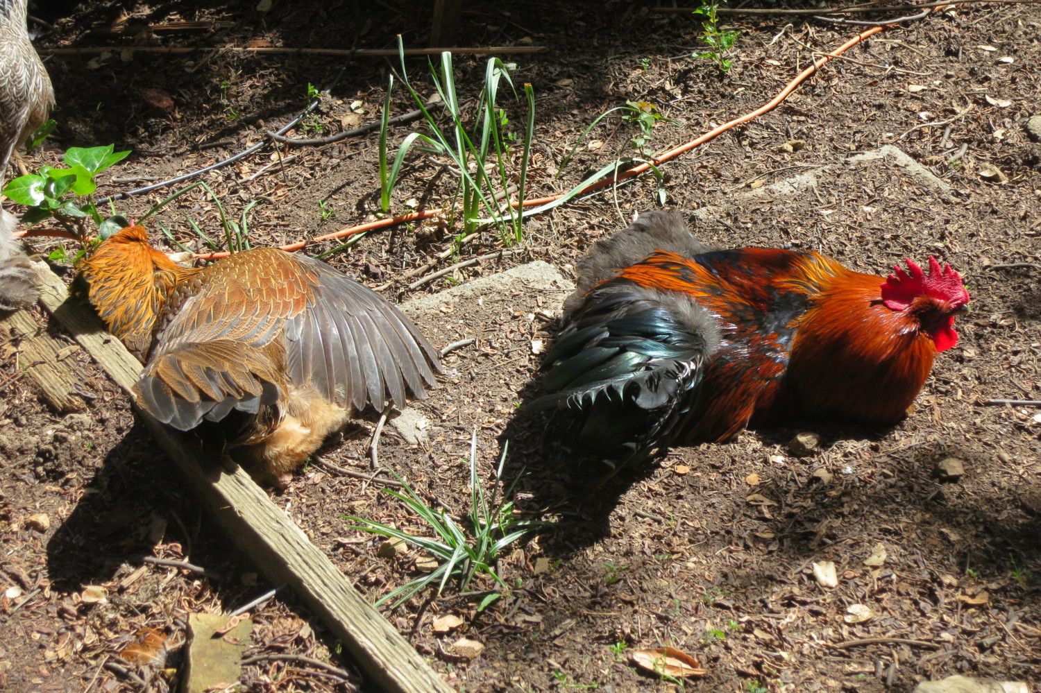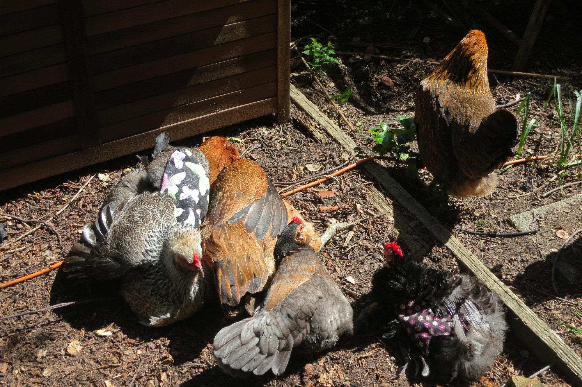 Just a wide shot of chickens/dogs roaming around where they please. Dora in front, Clyde to the right, Gandalf (the silkie roo) center, Cenere chilling in the gazebo area.