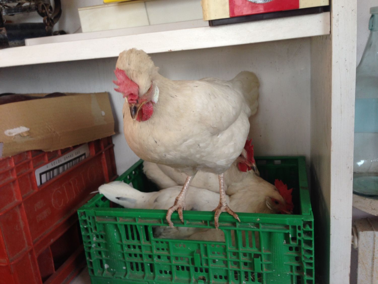 There actually was a possibility of triplet broodies, rather than twins... but their sister wasn't quite as determined. Oh, and that's their chosen nest box, which obviously was never meant to be a nest box, but an empty one in storage area... had to fill it with some hay after failing to convince them there were better places to lay.