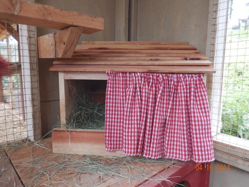 There is a website called Anna White. She has some wonderful plans for different items to build and sure enough there is a real easy nest box to build. I made one with her dimensions first, gave that one to the banties to use and then made another bigger one for my full size girls. They are really fun to make and come out super cute. I put curtains up because they seem to like the extra privacy.