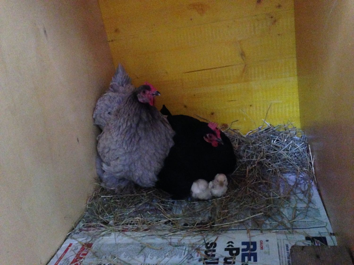 My two little cochins, Taffy and Freckles. I guess they are co-brooding because they are sharing the eggs. I dont think they have very many under them and thats good because I really dont need any more chickens right now!