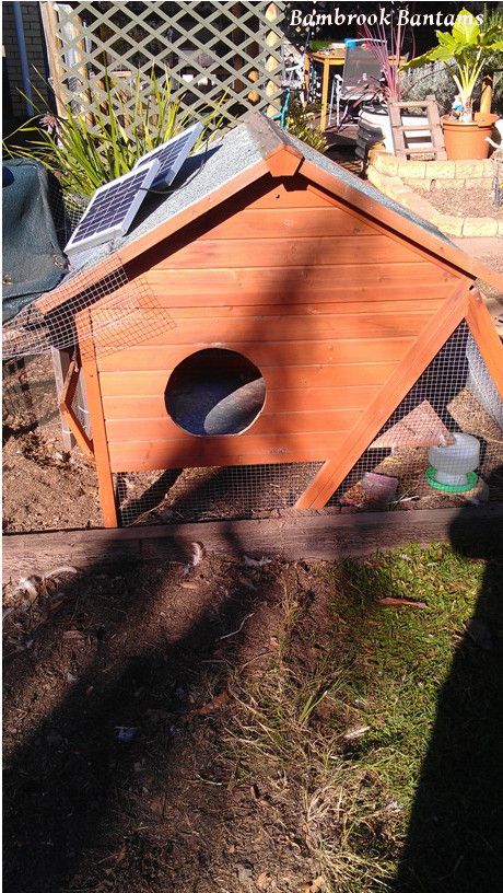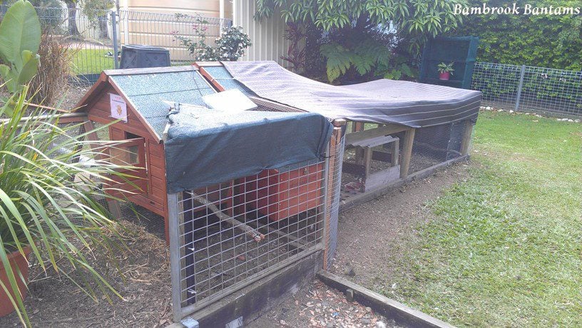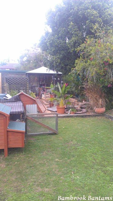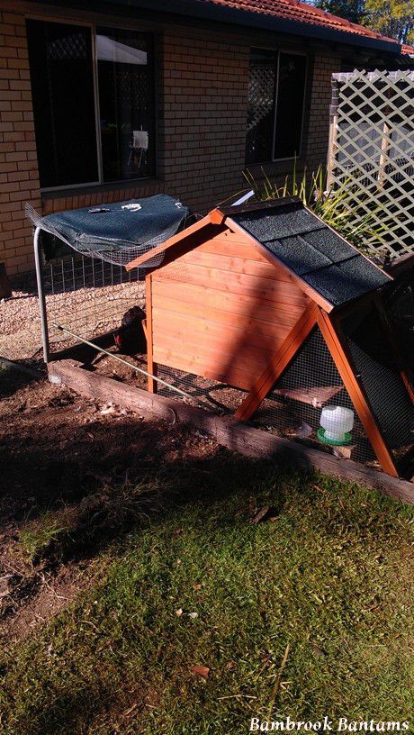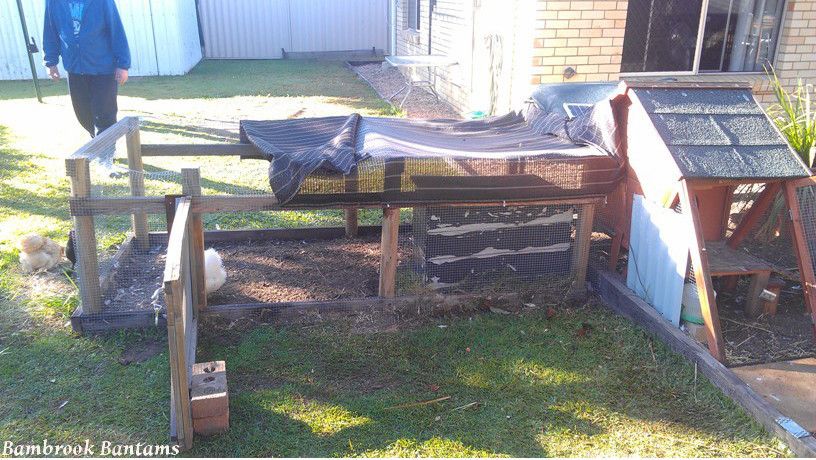 OK, so you can see the small A-frame run on the front of the Chateau which is what the broody and bubbies get to use. The little door leading onto the dirt-bath is what we close when we have bubbies. Obviously we have jumped ahead a couple of hours now as we have dug holes and repositioned the run. If you look close, you can see my 'rain shelter at the far end and the little lean-to structure with the colorbond roof is what I put their food under to keep it dry: