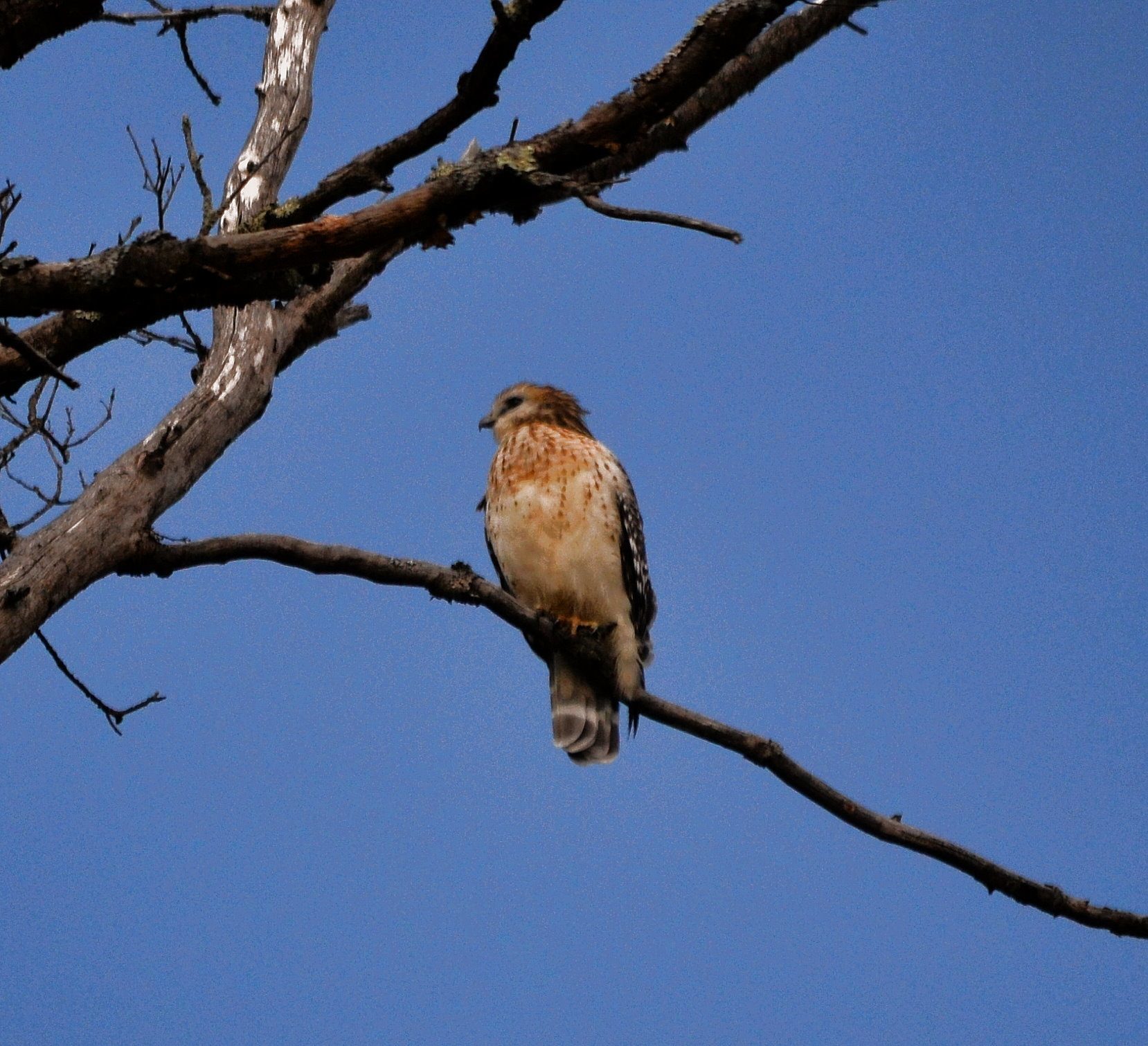 Last year we had a redtail taking up residence on our property....eyeing our chickens daily. We would go outside and scare it away when we would spot it....One day, the day after we bought some new bantams, I was outside talking on the phone while the girls were free ranging nearby. The girls happened to be right up around the backside of the house while I was standing on the deck. Suddenly the chickens all froze....pressing as close to each other as they could. At that moment, a huge female redtail came gliding by at my eye level....only an arms length away from me, between the deck and an above ground pool a few feet away....It was quite an amazing, yet intimidating experience. She was gliding by, taking a head count of the chickens! I could see her scoping them out. She was focused only on the bantams it seemed. Her wing span was about my own! I couldnt beleive how close she was. And how confidently she glided by.