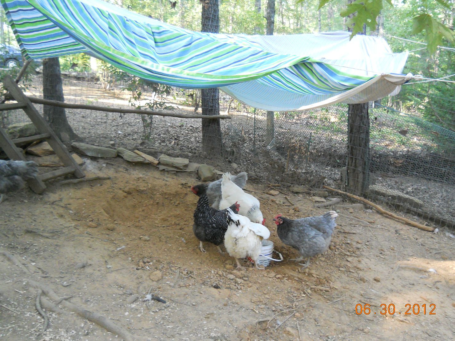 This is what we did today. DH took the 3 gallon bucket, filled it 1/2 with water and put it in the chest freezer overnight. When it was filled with water, it was 1/2 huge ice cube and 1/2 water. There is a round hole we dug ages ago for that size bucket in the ground, so that almost 2/3 of the bucket is underground. We put that out about 1 p.m. in almost 100 degree heat. At 6:20 p.m., the water is still ice cold, though the huge iceberg finally melted. He strung old bedsheets on cord across the top corner of the pen so the sun didn't beat down on the bucket and they did very well, some under the coop, some under the "tent" with the loose dirt and the ice water in their bucket. Granted, they got dirt in the bucket after awhile, but it was COLD.