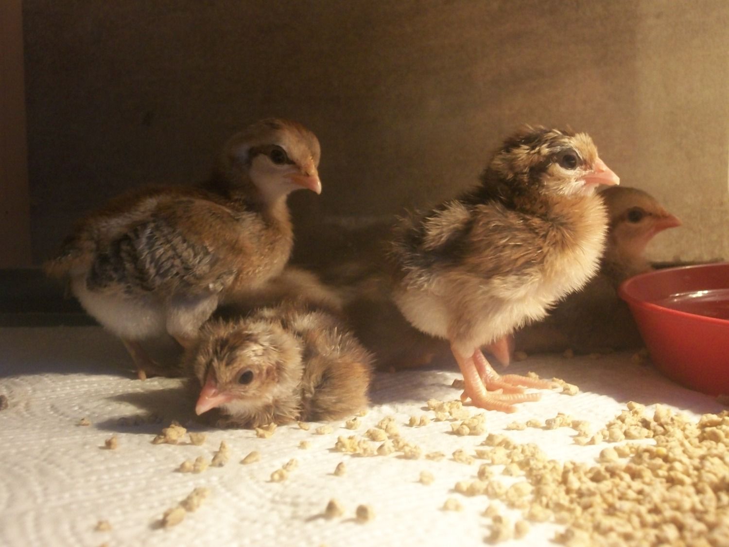 What variety are they? Duckwing varieties can be sexed by the eye stripe, Females have a dark stripe, males are very light or absent.I know some people have said that you can tell by an eye stripe on the chicks but I'm not sure which color their supposed to be but these have no stripes just the different color on two of them, I'll have to try and post a pic later