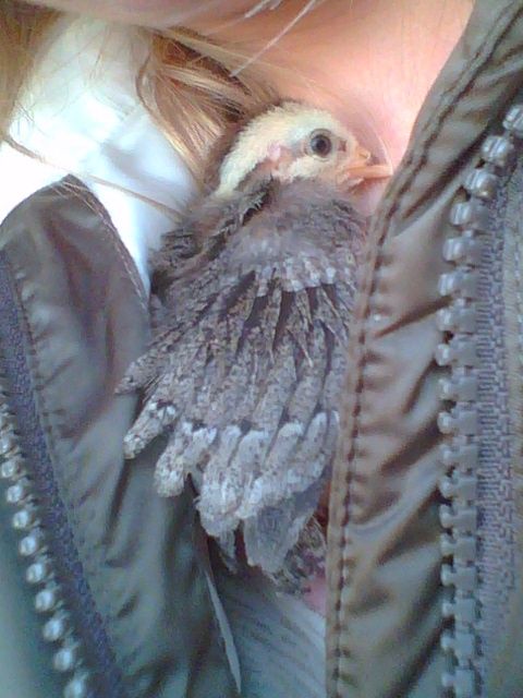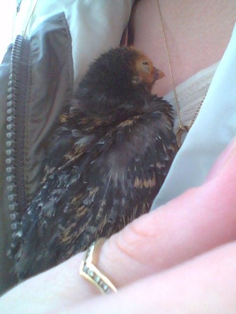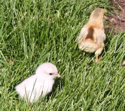 Had to share a few pictures of my first time mom with her three little fuzz balls. I think the whitest chick will be a splash. Does anyone have a guess on what color the striped chicks will be? This hen is probably not their biological mother, and the rooster is a blue wheaten.