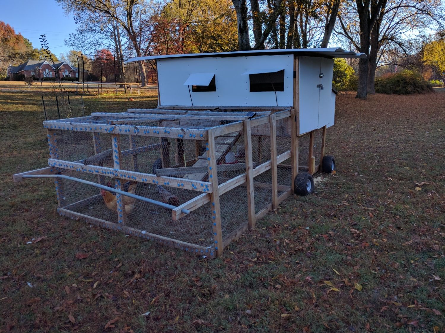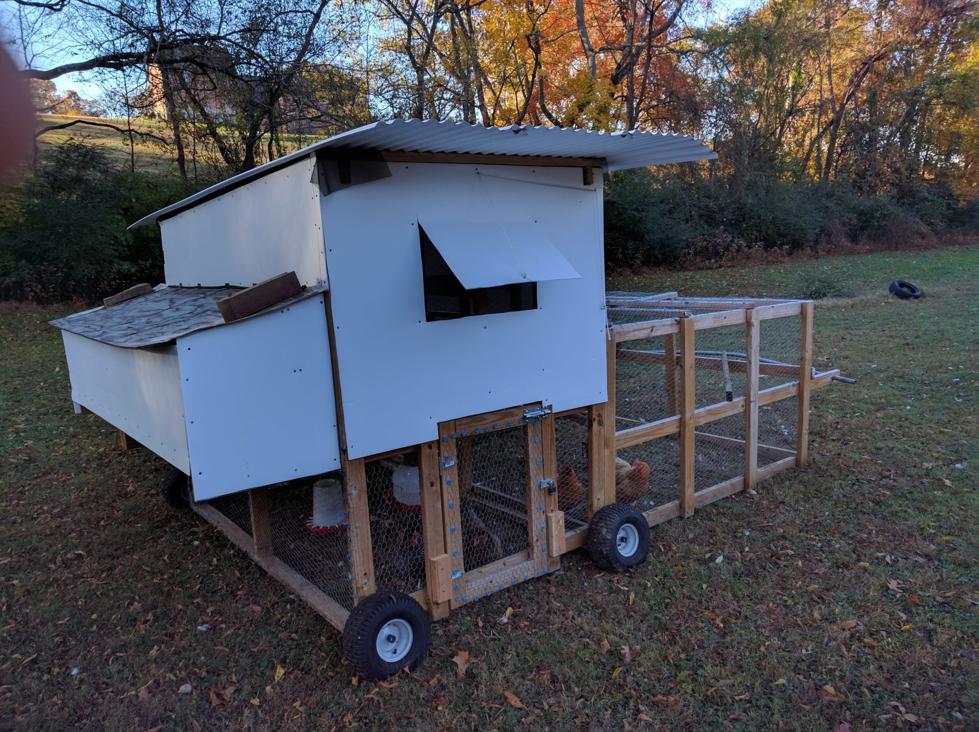 I started in February with 8 chickens, around 6 weeks old. We started them in my room in a cardboard box and a heatlamp, then quickly moved them to the garage where it was too cold and I lost one because my heat lamp wasn't warm enough. Got a better heat source and they did fine until spring, when I built the bottom part of my coop mansion. I made it too big, at 17 feet long and 8 feet wide and 4 feet tall, but could still move it. I then built the coop part on top and my chicken mansion sat still for months until I just recently got it moving again.
