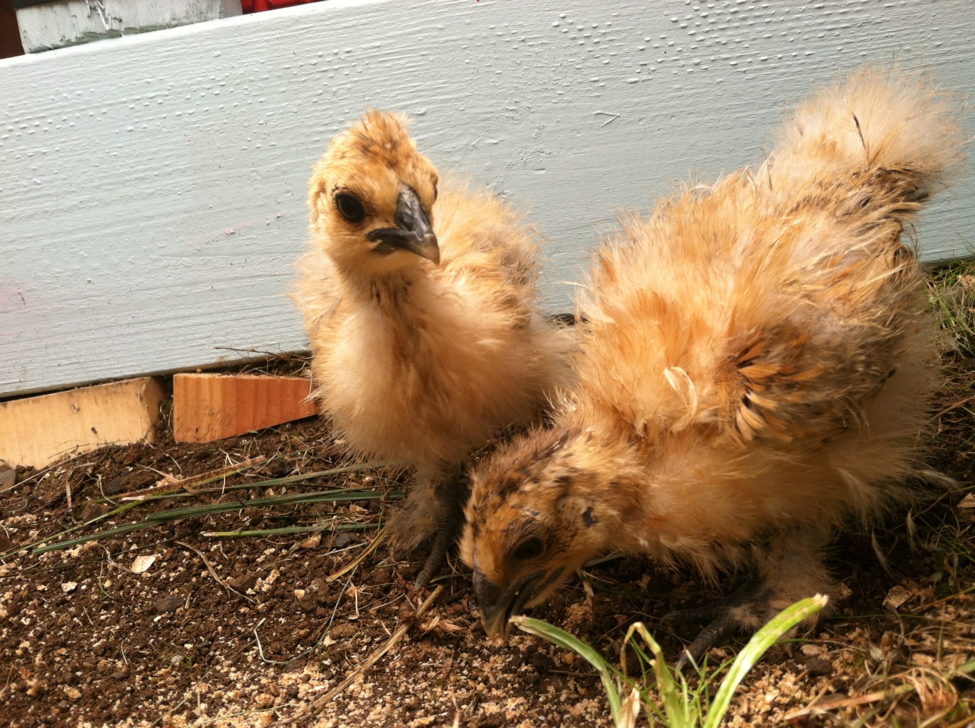 Sadly, the first little chick passed away but we still have the other two. They are our silkie bantams ("Jesus" and "Wanita/Juanita").