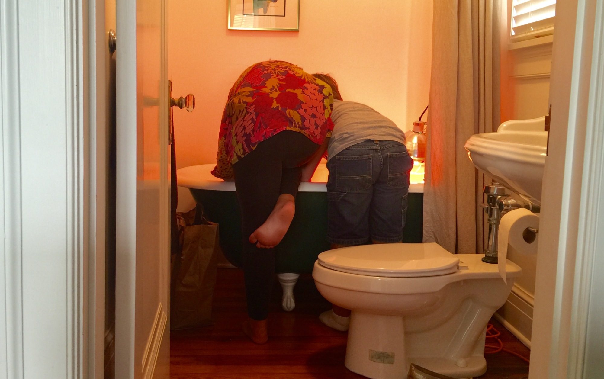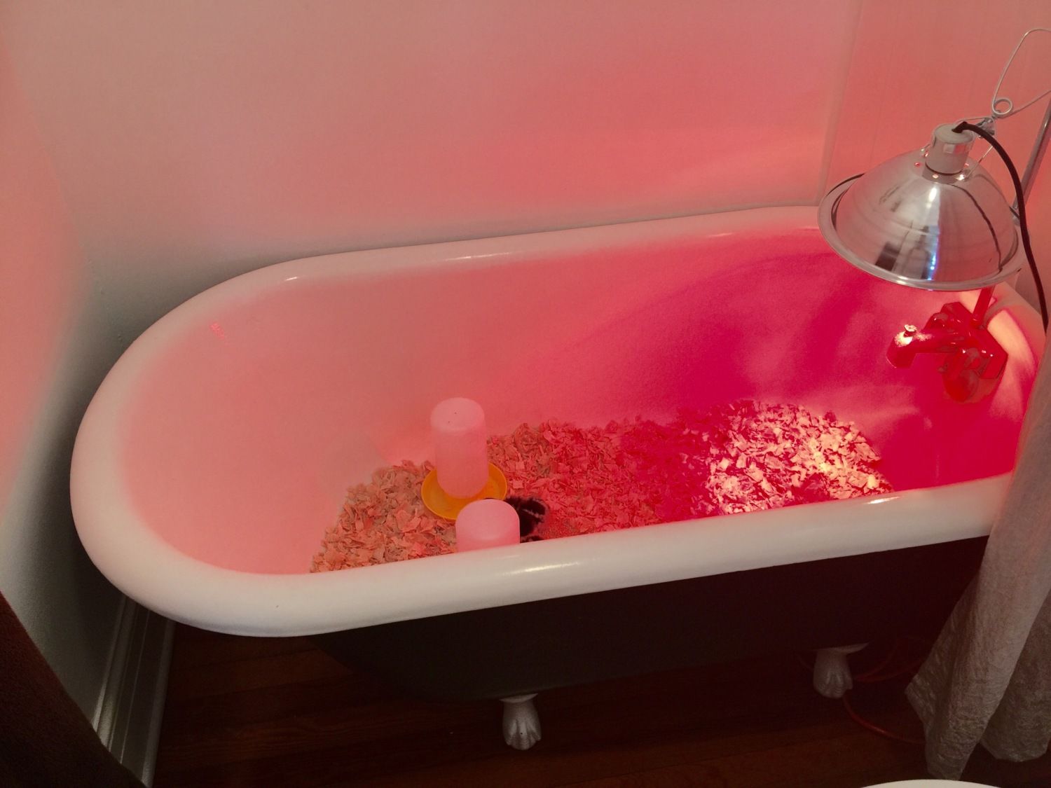 I accidentally came up with the idea. I was looking for a large plastic bin thinking I would keep it in our guest house and then move it when our two Kerry Blue Terriers came. My plan was to put the bin in the tub if I was in there working. As I was on my way to pick up the chicks it occurred to me. I asked my fabulous Hen Lady and she said it was a great idea. The seem to be flourishing. We put a wood hamster house in it but placed it upside down. They use it has a perch and this morning they were taking turns claiming up on it and practicing flying off. It was pretty cute!