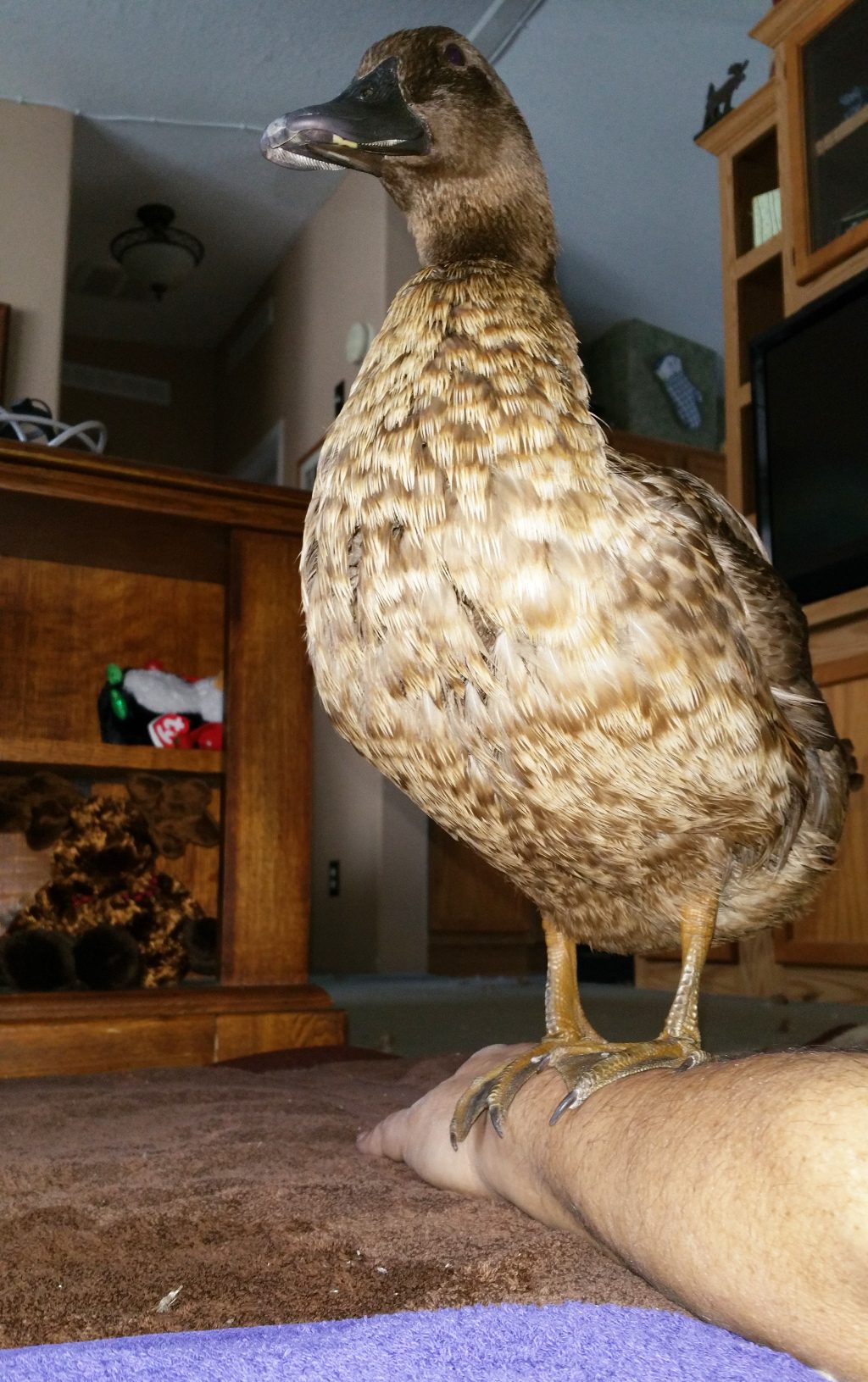 She also got a visit from Allie today since Allie had a very dirty frozen butt so she got nabbed for a shower. They actually got in a little bit of a chest grabbing scuffle in the living room. Surprising, but they weren't too violent with it. After about 3 minutes, Casey gave in and that was it. I think the root of that is because in the brooder, Casey was dominant, Latte was second and Allie was pretty much helpless because walking took all her strength and concentration. Now that Allie is full grown, there is no way a duck that weighed in this morning at under 4 lbs is going to dominate Allie's 9lbs, 15.4oz self. At 2-1/2 times Casey's weight, Allie is boss. After that, they preened, ate, drank and pooped together. Partially because of the last one, as soon as Allie was fully dry, she went back out and joined her flock.