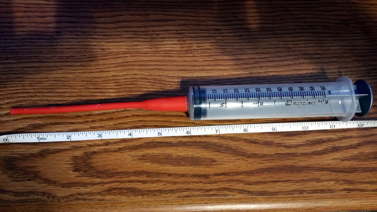 Yvonne is having a very hard time with the syringe and to be fair, it really isn't easy. I am sure the vet is using what they have, but they are 3ml syringes and the barrel is only 2-1/2" long, so by the time you are past the trachea in the "safe zone", you are in serious danger of dropping the whole syringe into the duck (the finger holds on the side of the barrel and the plunger would probably keep that from actually happening, but I've got it down pretty good now and that part is still kind of scary.) I would prefer a barrel that was 3" to 3-1/2" so I could hold it more securely. It is about 3/8" in diameter and that fits easily down Casey's throat so I would be happier with either a larger capacity (5ml same diameter) or thinner and longer.