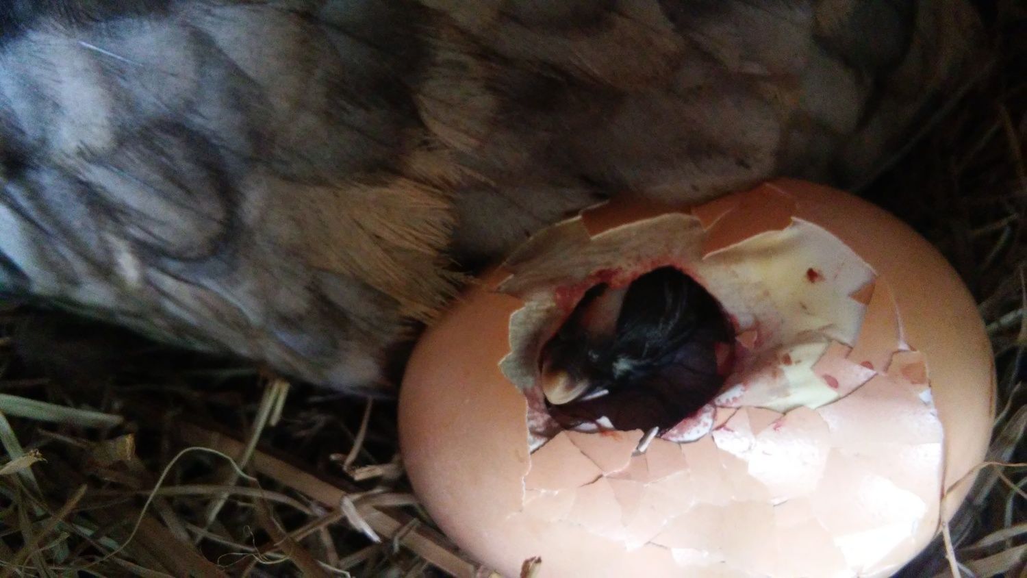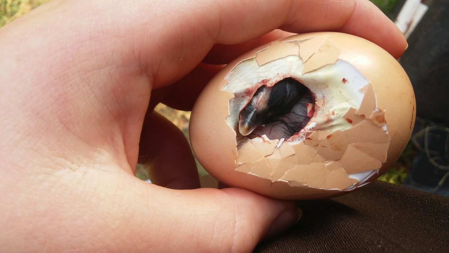 This little chick got crushed by a hen that wasn't supposed to be in the nest box. As you can see the chick has it's head out but on the wrong end of the egg!! The chick is alive and breathing normally. He just isn't peeping or opening his eyes yet.