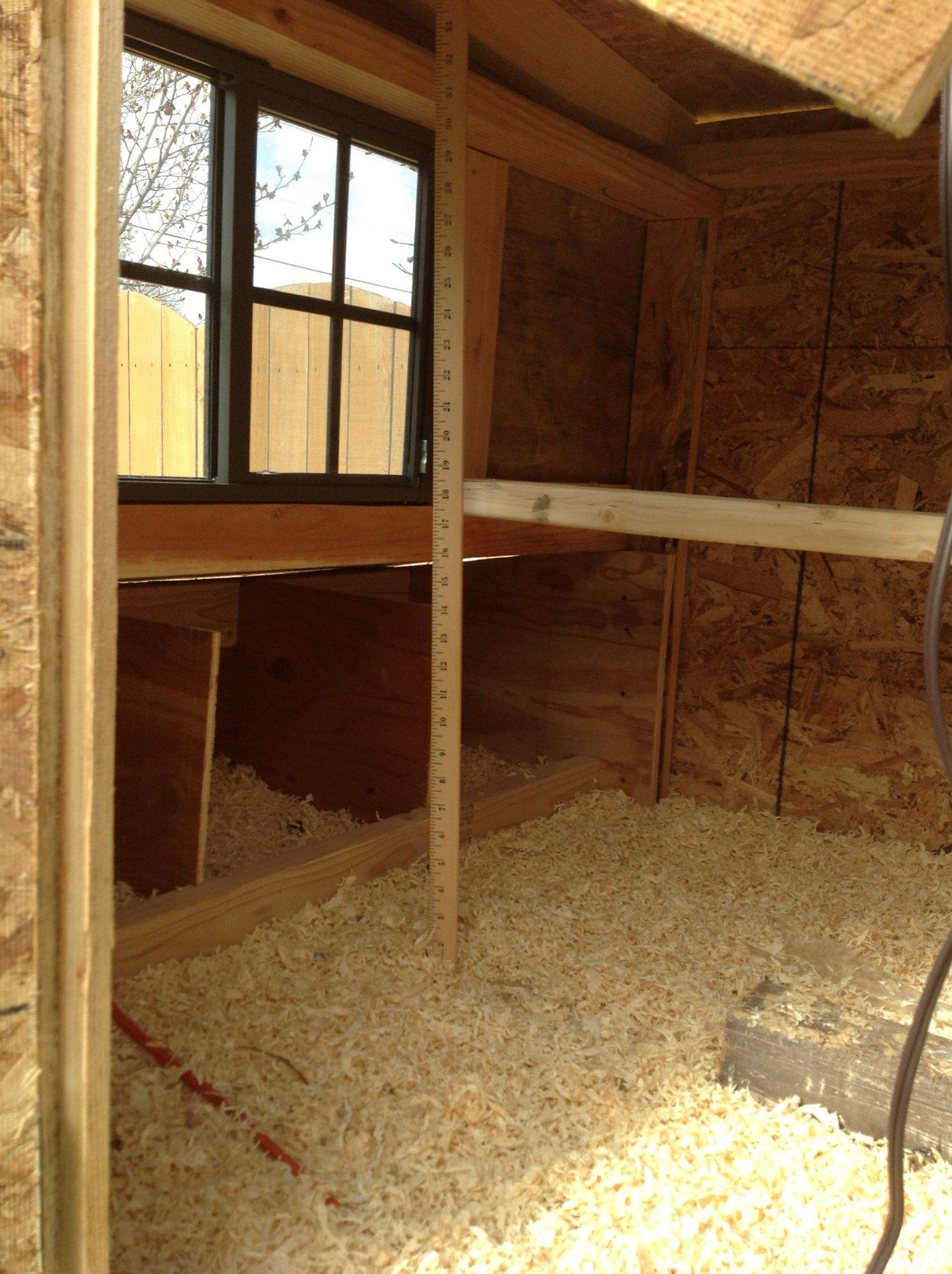 I have almost completed my coop, and I'm looking for any suggestions before i finish up. Mainly I'm wondering if I should change the roosting bar location. Should I move it up or down? I am also thinking of attaching another roosting bar to the first one and the front of the coop. The coop is about 5' by 4'. The roosting bar is 18 inches up. The second roost bar I want to attach on the side opposite of the nesting boxes. Any other suggestions are welcome. Please see attached photo. Also if you want to know anything about my coop's construction please ask. My chicken coop will also have a chicken run.