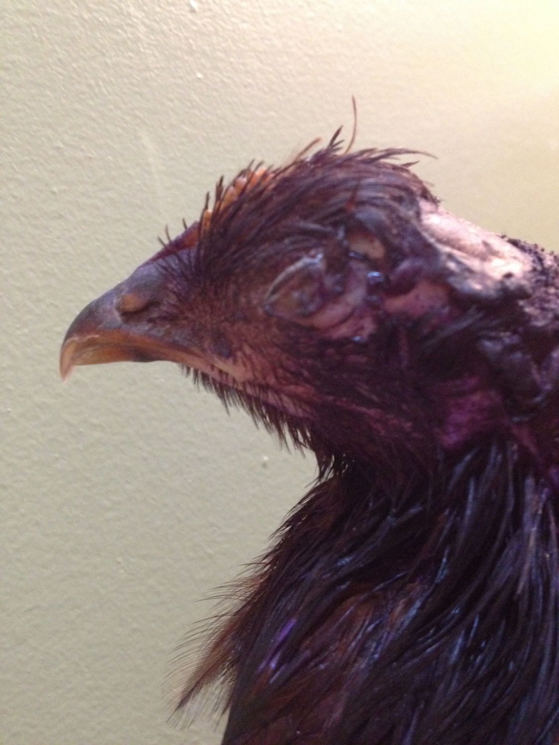 A week ago, a weasel attacked the pullet coop. Two of the six pullets were taken and one, Autumn, escaped with a bad ingury. The weasel managed to get most of her head feathers and an eye lid. All around her eye is swollen and her inner eye lid is closed. What bothers me the most is that she keeps on scratching her eye and a liquid seems to be comeing out.