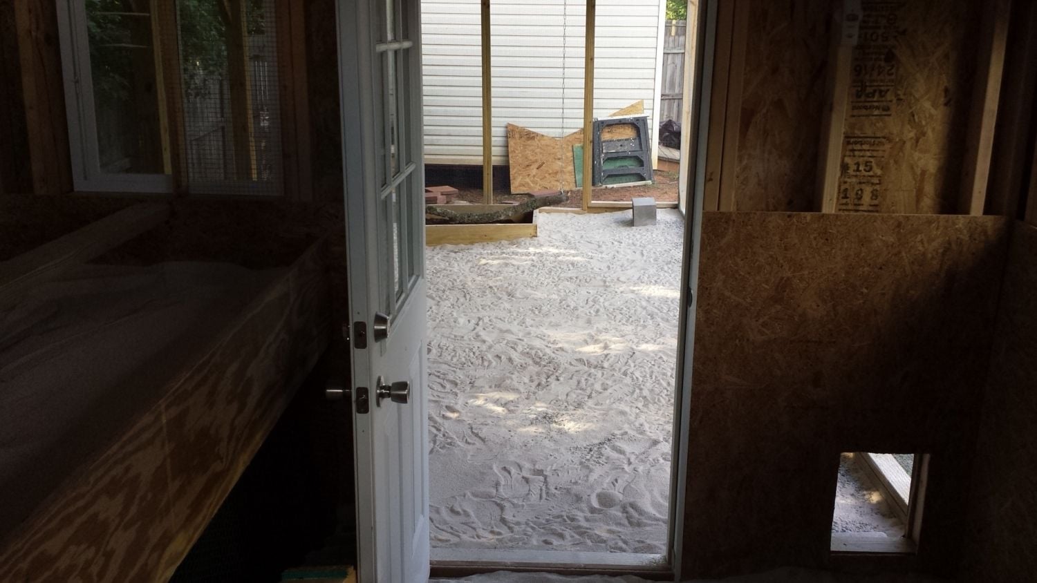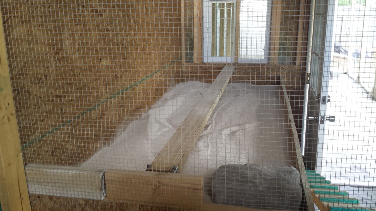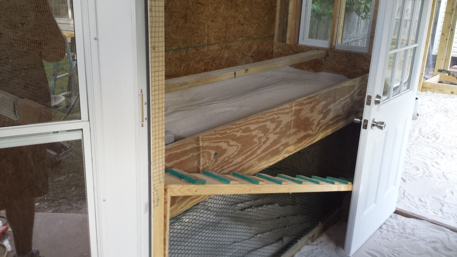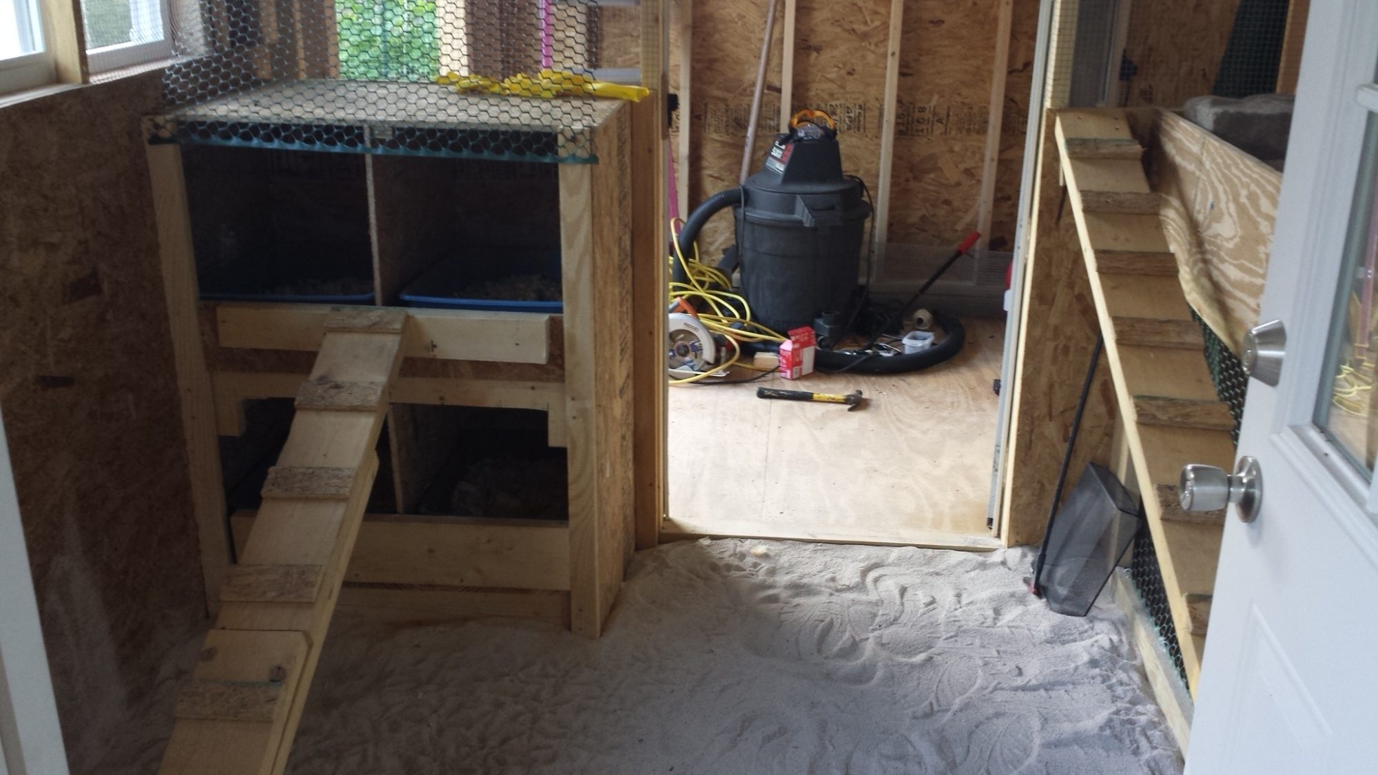 Here is my roughed in 8.5x10 coop. Large window wall is west, small window East, no window south wall where roost and poop trays go. North wall has door and unfinished poop door which if I can figure it out will be slotted. Ideas and suggestions are appreciated. Thanks.