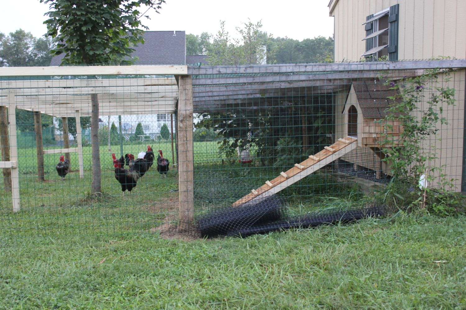 Carrying full grown chickens out in different groups during the day was so much work. But, they are alive and prospering. They are all normal sized and there are no runts. They are mostly barnyard mixes but, at this point, I'll take a healthy mixed chicken over an unhealthy purebred chicken any day. Here is a pic of the boys in their new run...