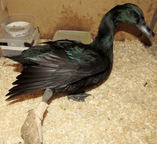 I just noticed my two month old Cayuga ducks foot is flopped all the way under her where she is standing and walking around on the top of the foot. She's active and eating and will lay down if the other three are staying around her. I am feeding niacin. I do not know when this injury started unfortunately. Foot looks normal otherwise and I can bend it easily. If this is an injury, are there any products or boots I can get to help stabilize it while it heals?