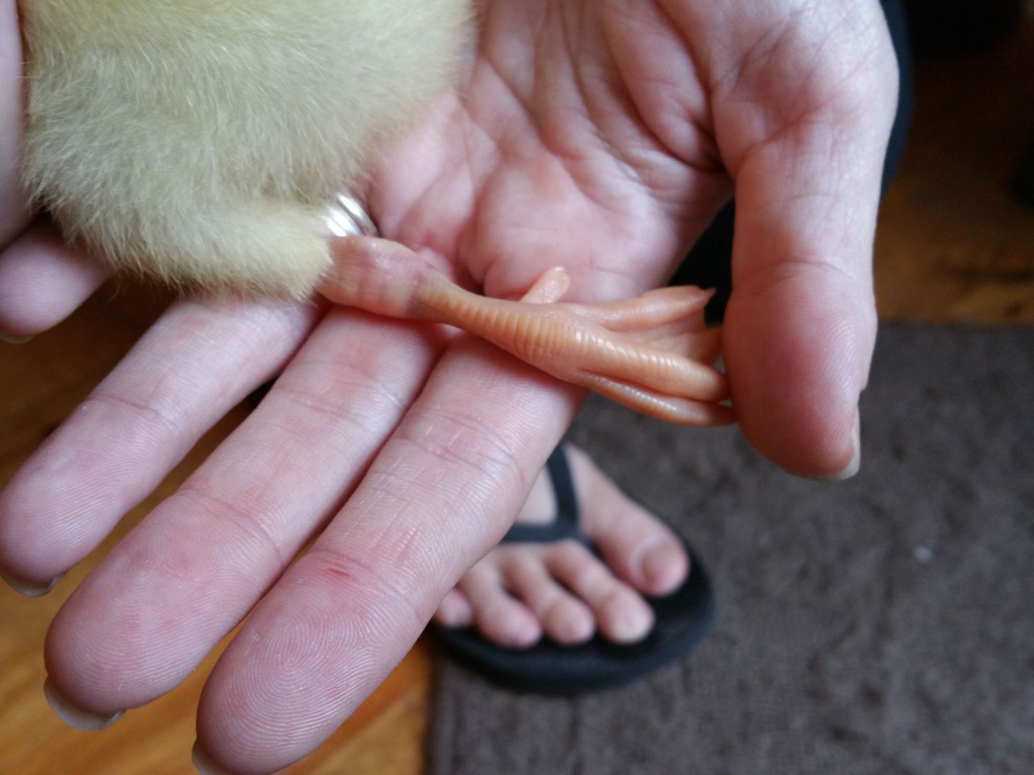 It's hard to tell how bad her leg was last night seeing it this evening. I had to double check I picked up the right duckling to check her out. She had two floats in warm water today, the second time around with one of her sisters. She literally just floated while her sister darted around, so I don't doubt her leg was a little sore still. It's hard to see in these images, but she has a little bruising on her right leg on the inside around that knuckle/joint and a little around the leg just below that. Last night her whole foot was swollen and very dark pink, today it's the same color as the other foot and she seems to be walking fine on it. I'm going to keep her confined for at least one more night and day. Out baby goose that is in with them is not happy to be seperated. She is with one duckling and then another of our three is keeping the injured duckling comfortable. The gosling cried ALL day today, she does not like for them to be seperated. I am using ceramic heating bulbs (no light emitted), but last night had to use a red bulb on the second brooder. Up until last night everyone slept quietly through the night, so I'm curious how much the red light had to do with all the crying last night. My husband is picking up another ceramic heat bulb to use tonight. Crossing my fingers we get some sleep and that our injured duckling will be up for the main brooder by tomorrow evening. I deinitely won't rush it, though.