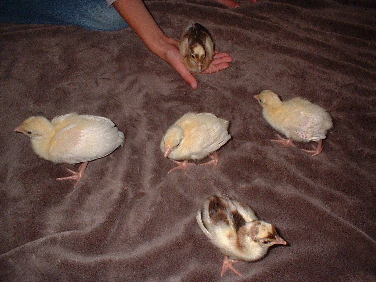 With the guineas, we used the biggest rubbermaid storage tubs we could find, I believe they were 22" wide by 38" long, not sure how deep, and we made wire lids with 1/2 inch square wire. We lined the bottom with pine shavings and covered them with paper towels for quick clean up twice a day, and dumped and refilled the shavings once a week or more often if needed. We put a T post in the ground next to each brooder, so that we could clip the heat lamp on it and adjust the light holder up or down to adjust the temperature. I don't remember how many birds we put in each the last time we bought 50 guinea chicks. I'm going to buy the biggest tubs that I can find, but was thinking I'll need at least 6. My mom says we only need 4... We're getting 50 guineas, and 6 pea's. I don't think 56 birds, especially wiht 6 that start out twice as big as guineas, will fit in 4 tubs.